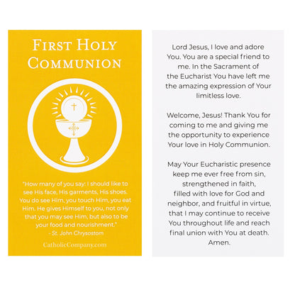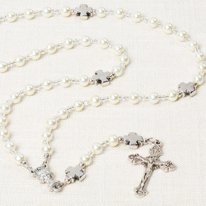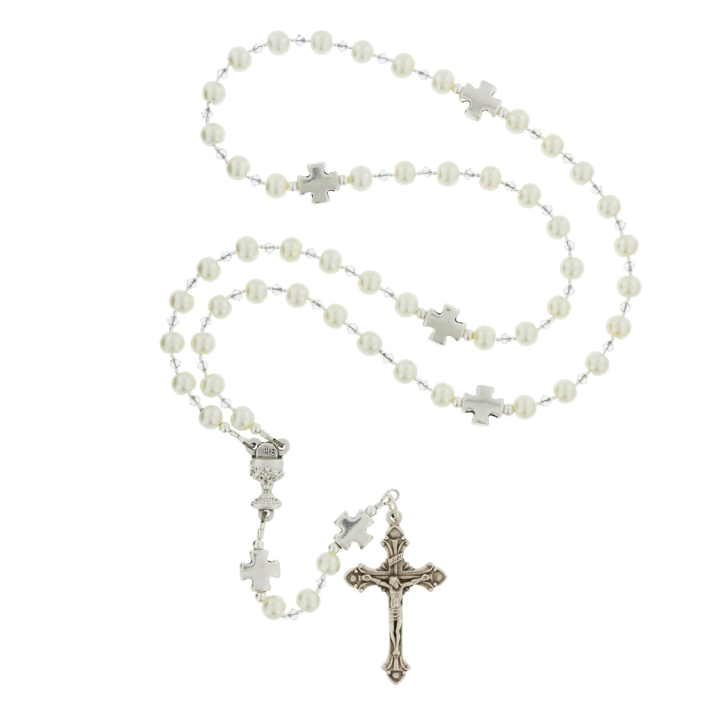 On such an unforgettable day as First Communion, a fitting keepsake gift is in order. A good choice for a young girl but also appropriate for an adult who may be receiving Holy Communion for the first time! Glass Pearl beads are paired with Swarovski crystals and silver colored hammered crosses which act as Our Father beads. An Italian chalice centerpiece is a continuous reminder of Christ's gift of Himself to us in the Blessed Sacrament. Includes a thoughtful prayer card with a quote about the Eucharist and a prayer to Jesus after receiving Communion.