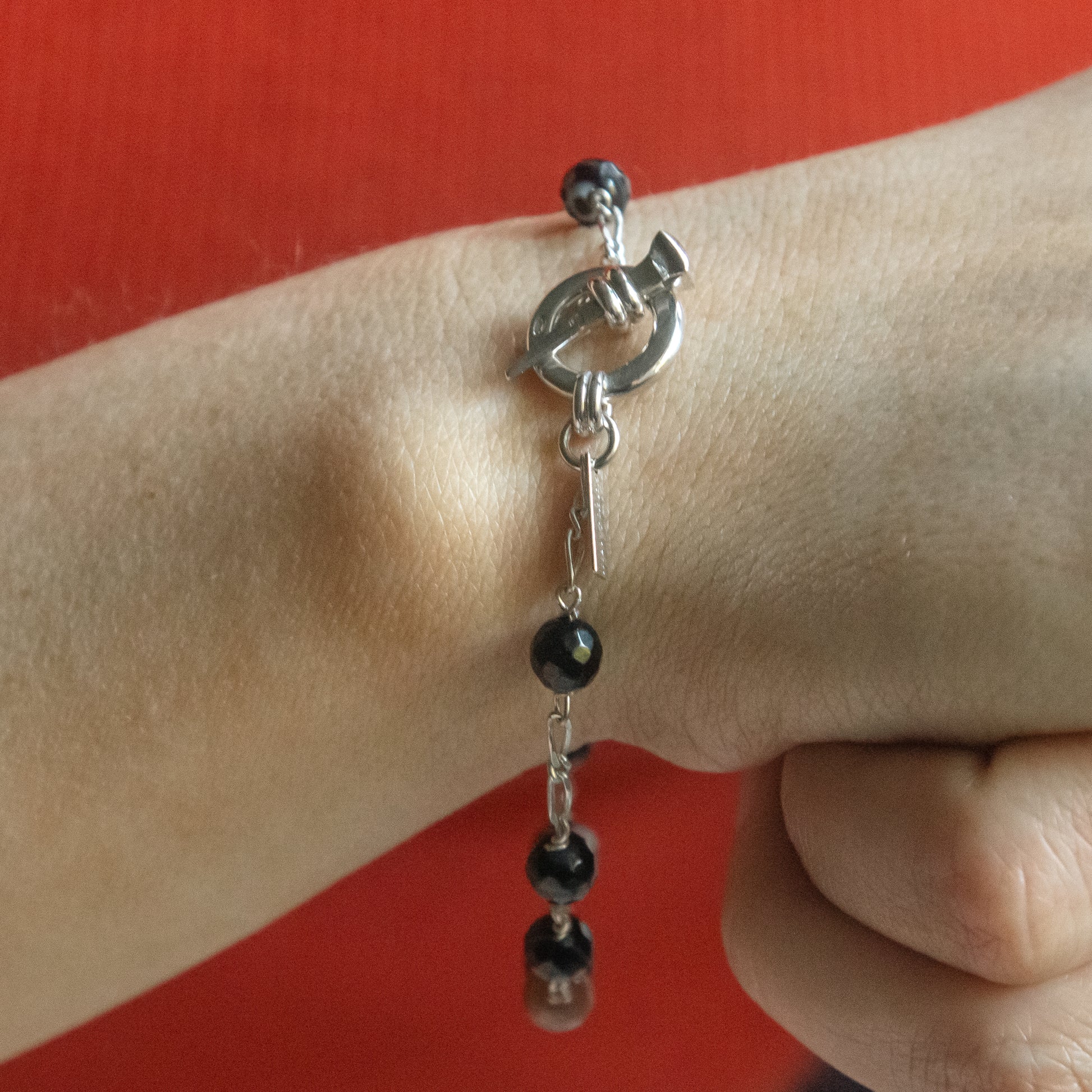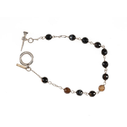 A rosary bracelet made of Brazilian Agate, featuring sterling silver accents that highlight the natural tones in the gemstones. The distinguising feature of this rosary tenner is its toggle clasp. The bar of the clasp is a miniature, sterling silver nail, to remind you that Christ died for you, and inspire you to live for Him. A faithful piece of jewelry and a single decade rosary in one. Made in Italy.