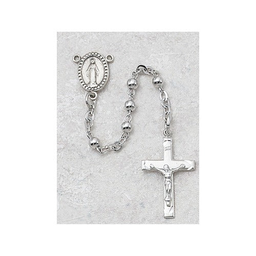 This elegant full-size rosary is made completely of Sterling Silver, making it a special gift for any sacramental occasion. The small 3mm beads move smoothly through your fingers, and the centerpiece features a delicate portrayal of Our Lady