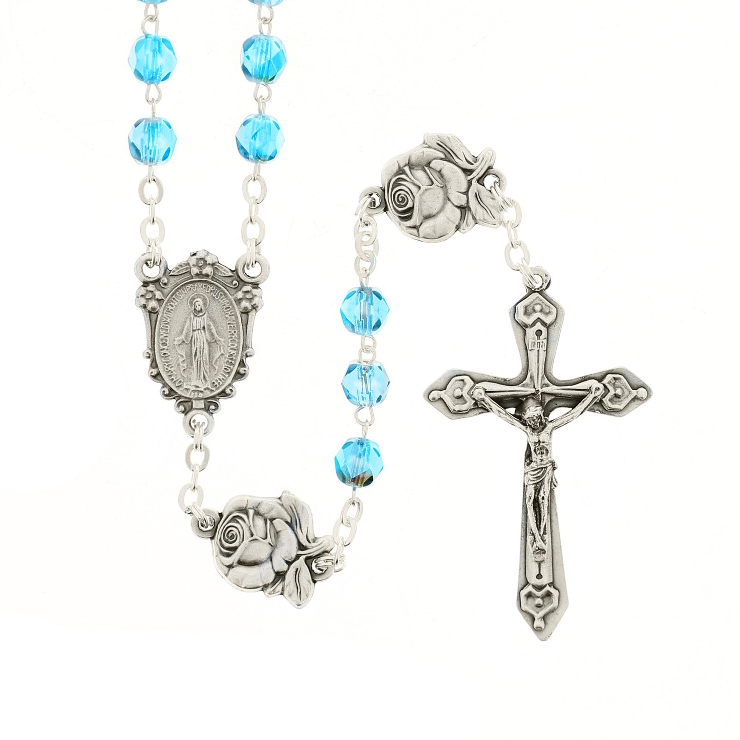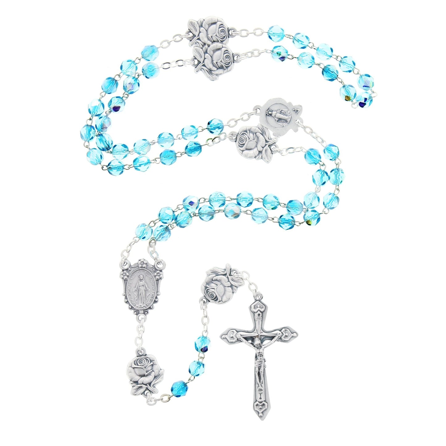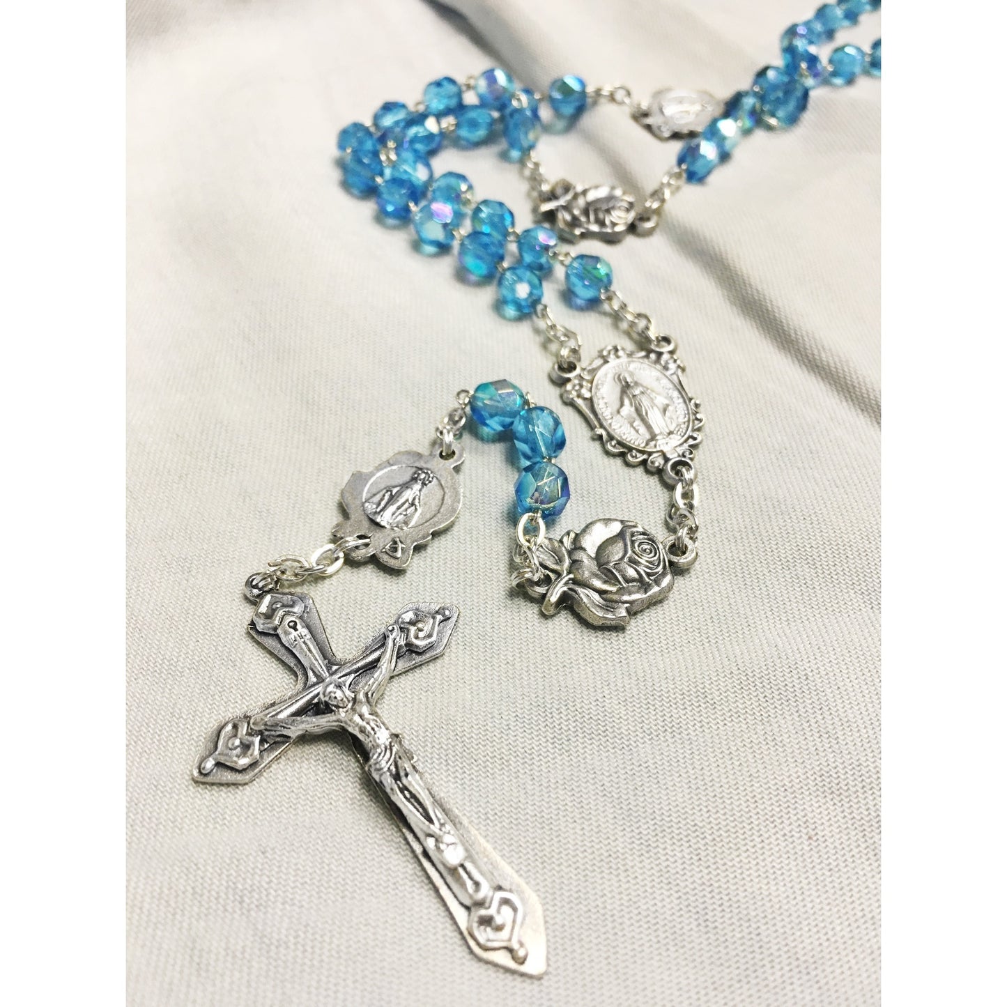This gorgeous rosary features aqua-blue Hail Mary beads and rose-shaped Our Father beads, with an elegant Miraculous Medal centerpiece. The blue shade calls to mind the humble yet queenly mantle of Mary, and the roses add such a unique, elegant touch. This makes for a wonderful gift!