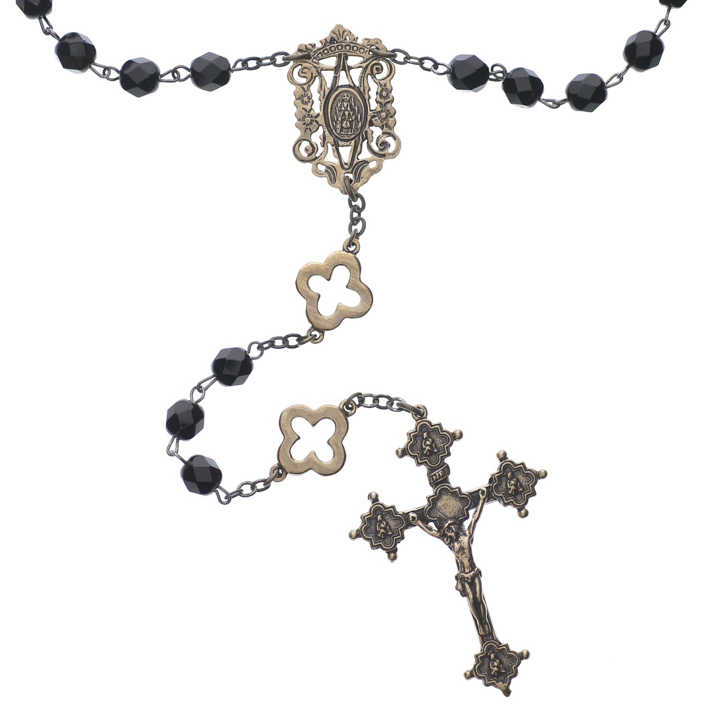 This delicately crafted rosary features black beads and stylish quatrefoil accents for a mix that reflects the beauty of the Holy Rosary. A bronze Ave Maria centerpiece draws us to the intricate scrollwork and the traditional insignia of Mary, while the ornate crucifix is reminiscent of the elegant pattern of an old Marian centerpiece. Our Blessed Mother has asked that we pray the rosary. Honor her while uniting your heart with Jesus while you pray with this unique rosary.