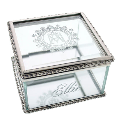 This elegant Ave Maria insignia display box creates a perfect spot for a cherished rosary, jewelry, or other keepsakes. The box features bevelled glass trim, an intricate border. and a mirrored base that reflects the beauty of its contents within. Personalization may be added in the font shown, adding a wonderful feature for a thoughtful gift.