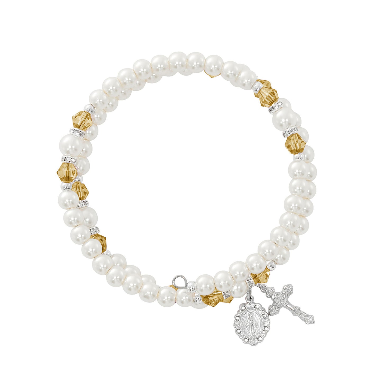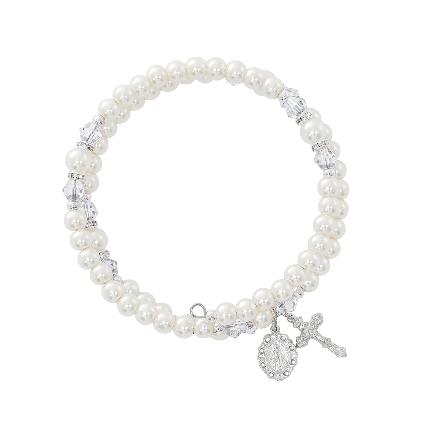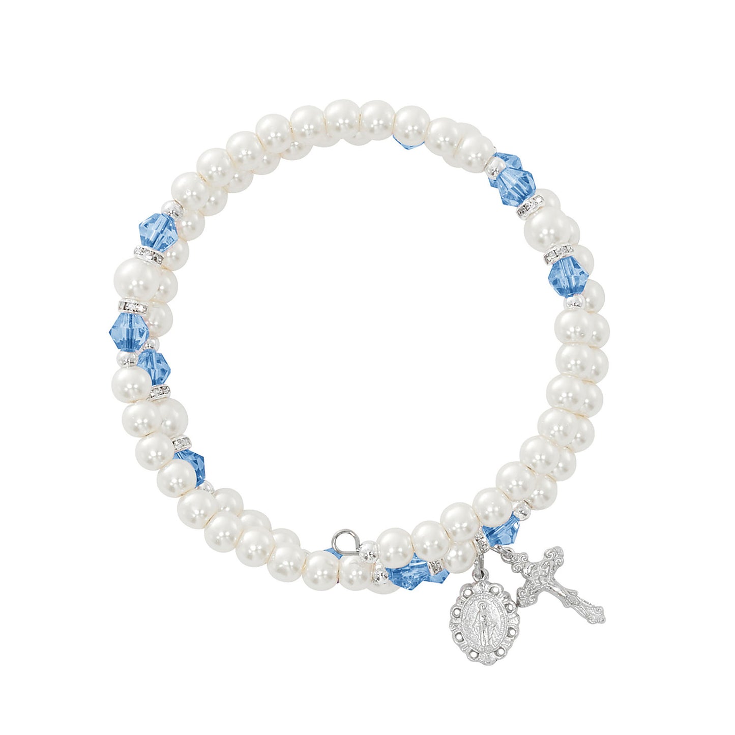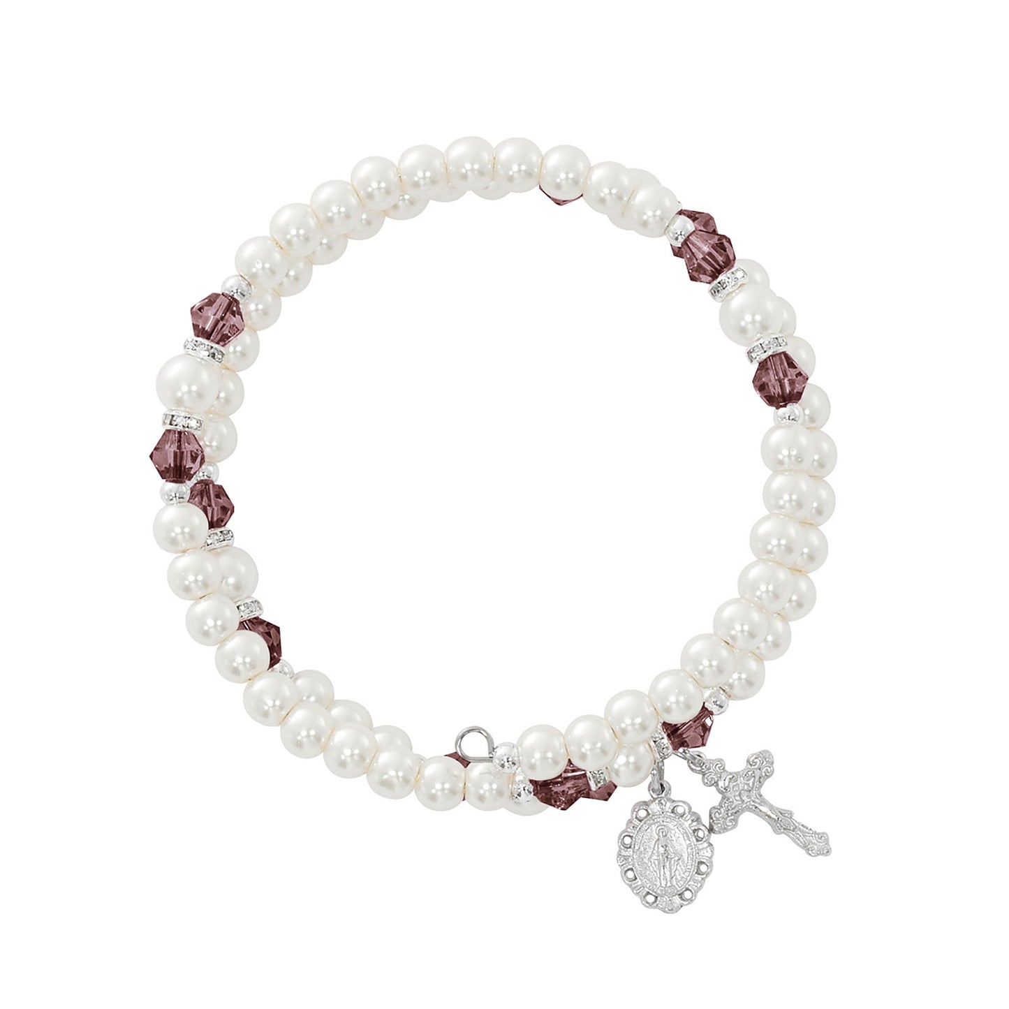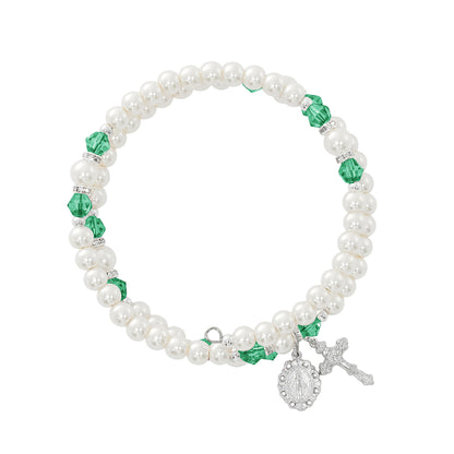 This lovely Rosary Wrap Bracelet features a full five decades, wrapping repeadtely around her wrist. The Our Father beads are flanked with crystal bicone beads, brilliantly faceted and available in the birthstone color for each month of the year. Rhinestone spacers accent the birthstone beads, making it even more elegant.Ā