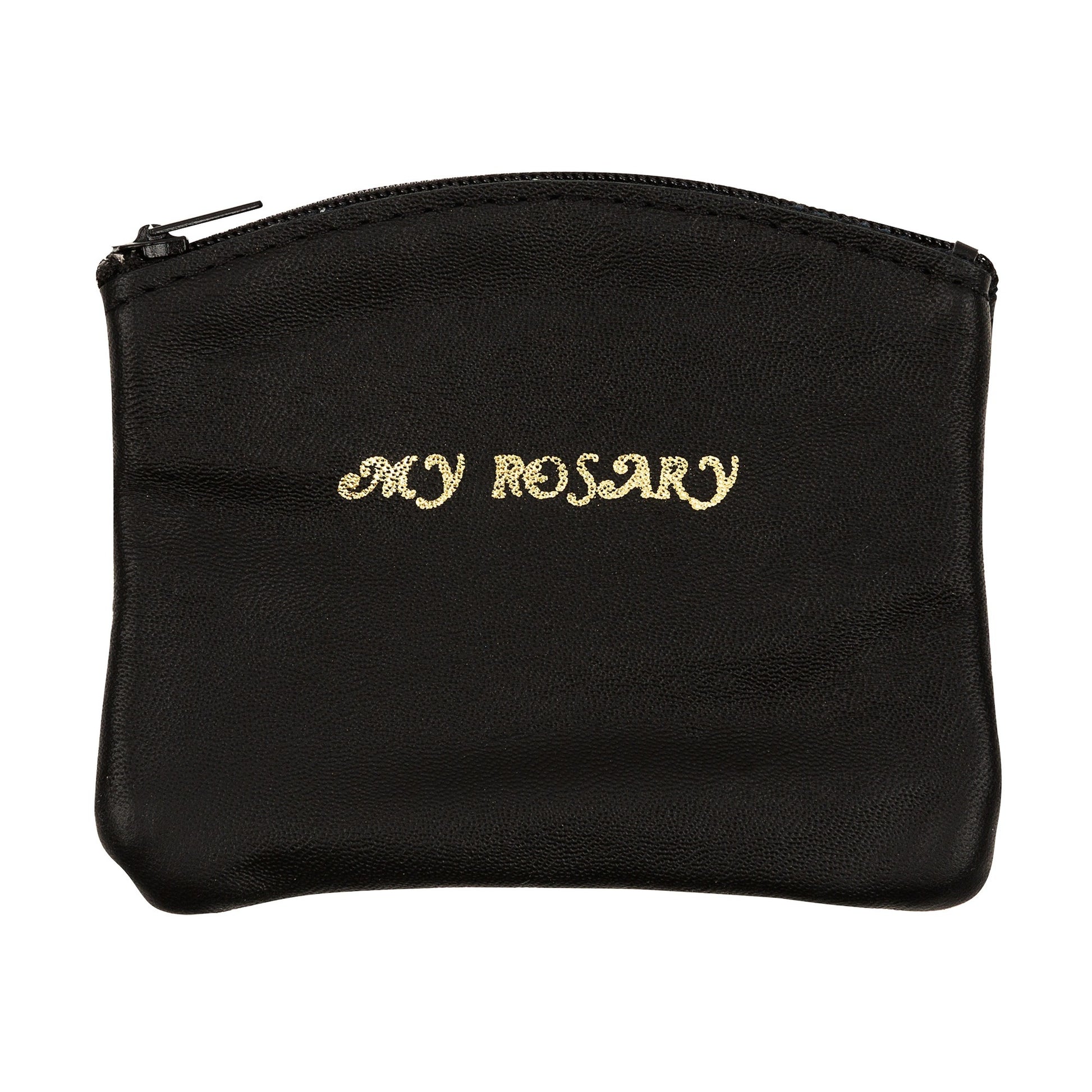 - Black leather rosary pouch with zipper closure
