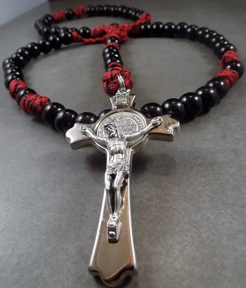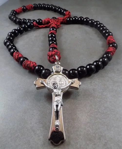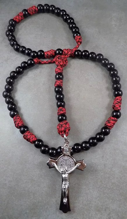 This is a handsome and strong rosary made in the expert craftsmanship and tradition of Black Monk Rosaries, with profound attention to detail. Red industrial strength paracord resistant even to UV rays, moisture, and degrading combines with high impact, black acrylic beads made to last a lifetime. Much more durable than plastic, which can scratch and fade over time, they are accented by a prominent St. Benedict Crucifix.