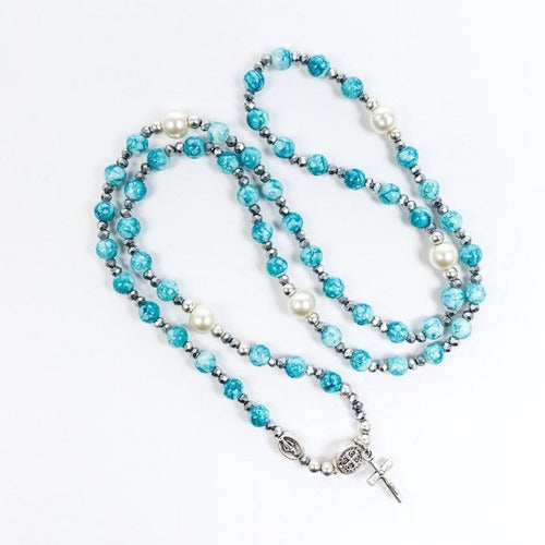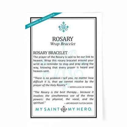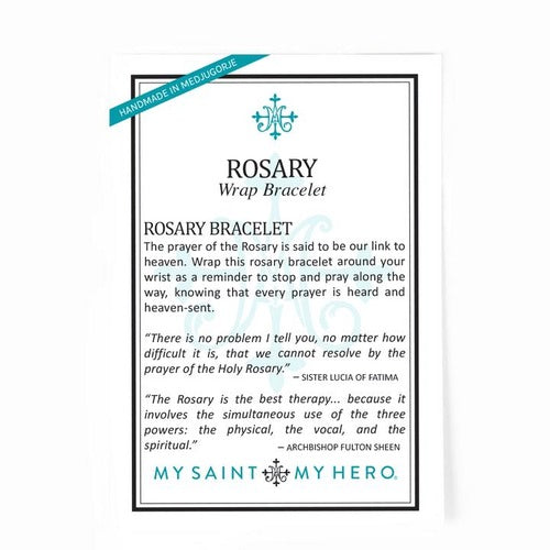 This pretty wrap bracelet is more than just an accessory. It is the rosary, to remind you to pray as you go, and seek Our Lady's help always. She is as close to you as if she were holding your hand. It is made of silver tone and bright sky-blue beading, in Medjugorje, with St. Benedict and Miraculous medals made in Italy. Comes on an inspirational card, gift boxed.