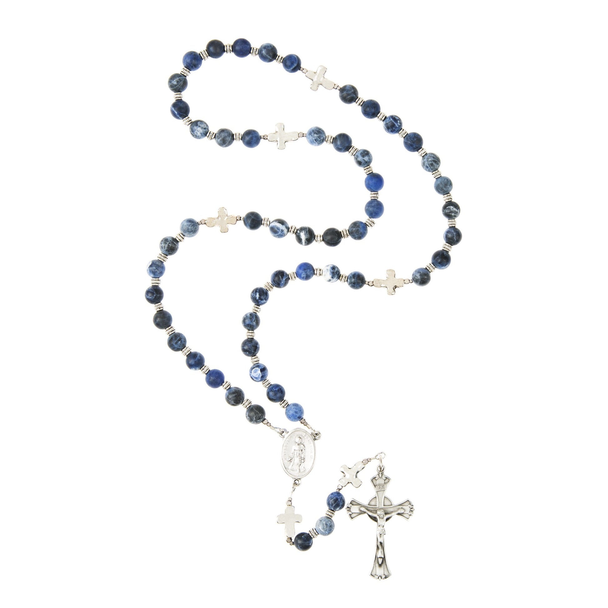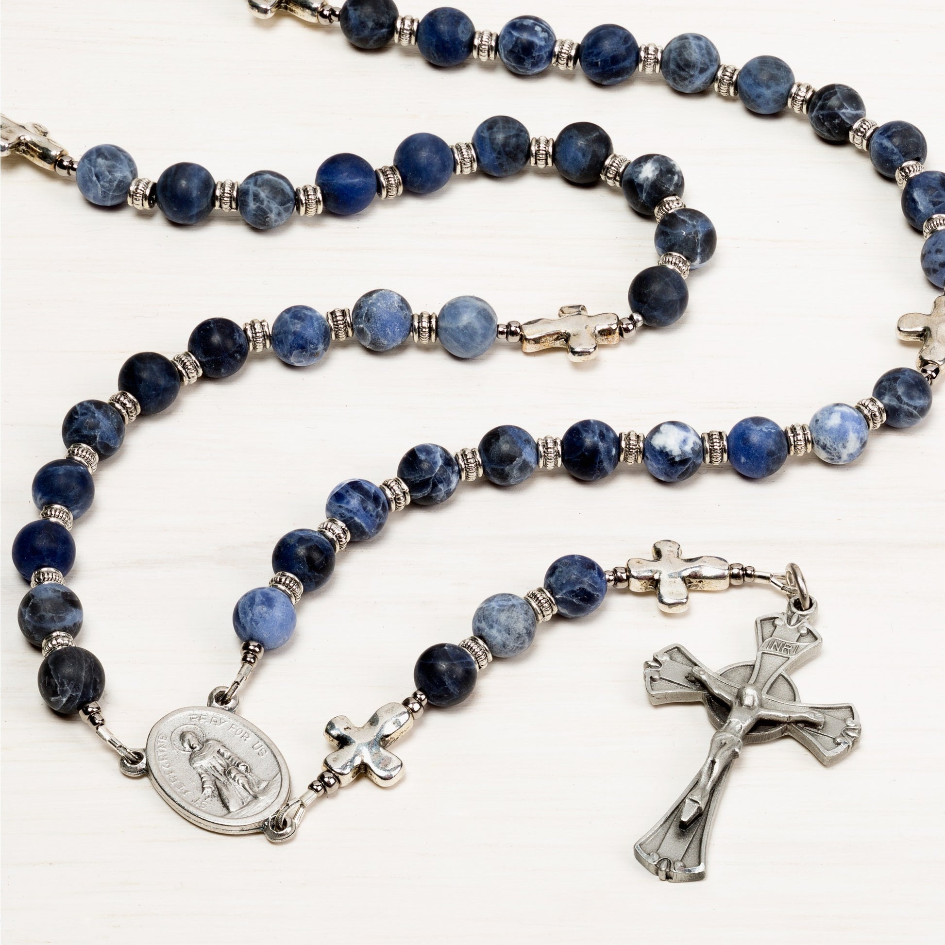 Whether you are experiencing a serious illness or you are praying for a dear one who is suffering, this comforting rosary will help you stay close to God’s merciful love. He uses his servant, St. Peregrine, as a source of hope and intercession as patron saint for those suffering from cancer, AIDS, skin diseases or other serious diseases. A St. Peregrine medal is at the center of the rosary. As your fingers move around the mysteries you will feel the smoothness of the sodalite beads. Sodalite is a very special stone since it is not often that blue is found naturally in the earth. For Catholics, blue is a color full of meaning. We attribute blue to Our Lady, to heaven, to the cleansing waters of Baptism, and to obedience to God’s Will. The Our Father beads are actually small,silver, hammered crosses. It is a gentle reminder to join our sufferings to those of Christ and to never lose hope. Prayer card included.