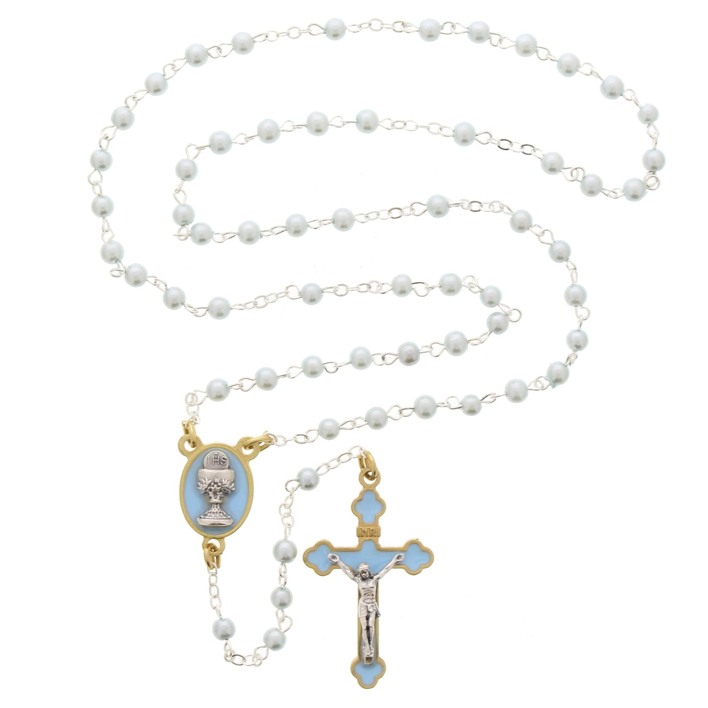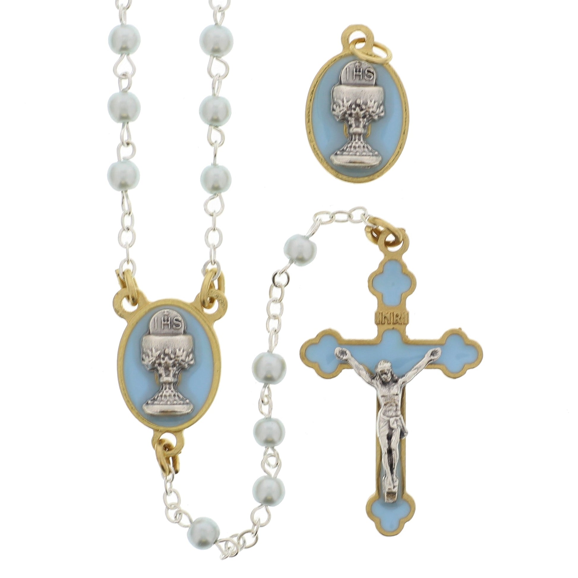 Designed for boys as they celebrate their First Holy Communion, this blue rosary gift set features light blue pearl-style beads that host a chalice centerpiece along with a blue accented crucifix. Includes a matching chalice pendant medal. An attractive set for a special young man as he receives the Blessed Sacrament.