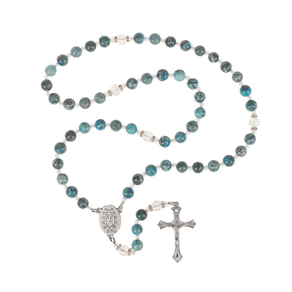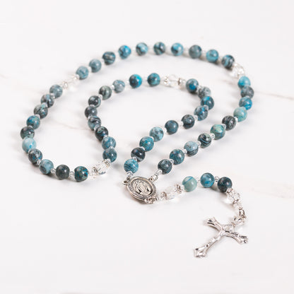 This striking gemstone rosary is made of Phoenix Jade, in rich blues reminiscent of the skies. The marbled beads have grace and movement, in hues from teal to turquoise to midnight blue. Clear crystal Our Father beads and silver spacers accent the rosary, and the finishing touches are a traditional and gleaming silver Miraculous Medal and an ornate and finely detailed Crucifix. An exquisite rosary for her.