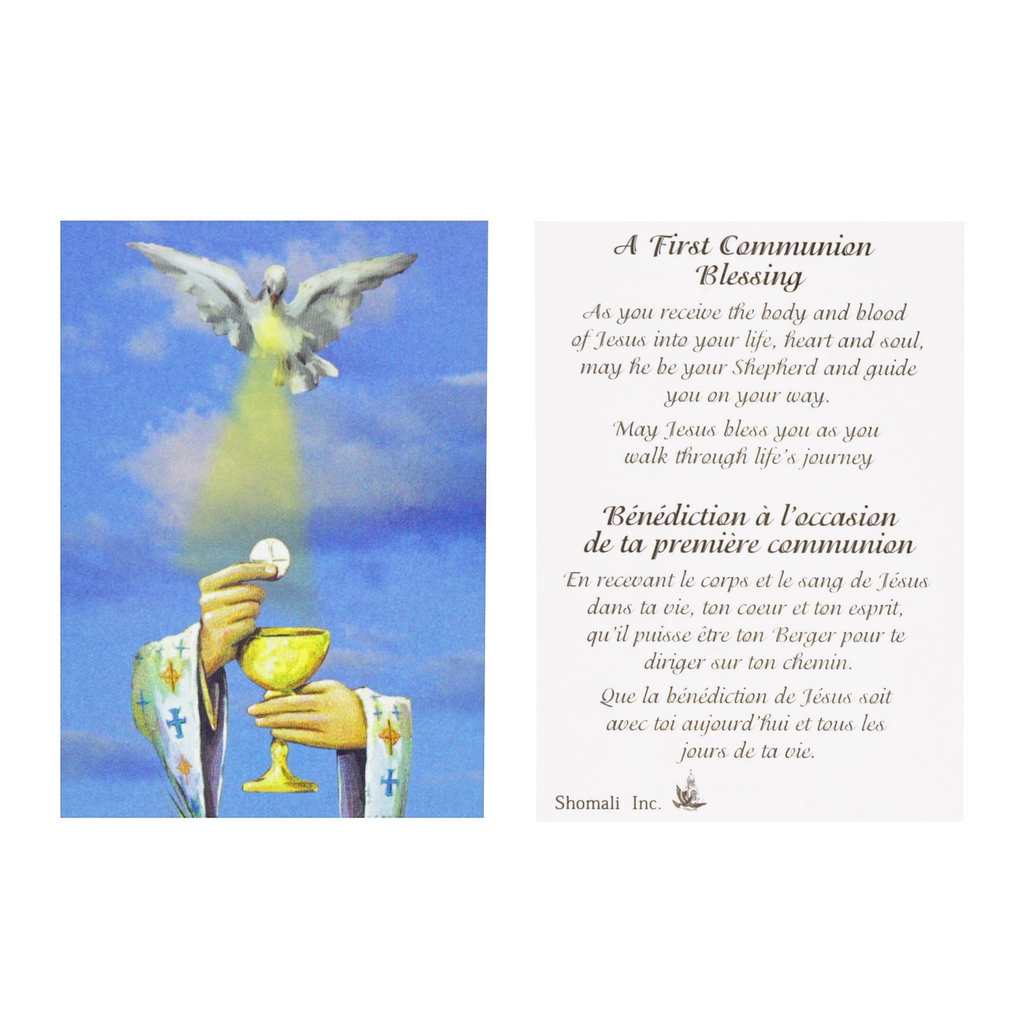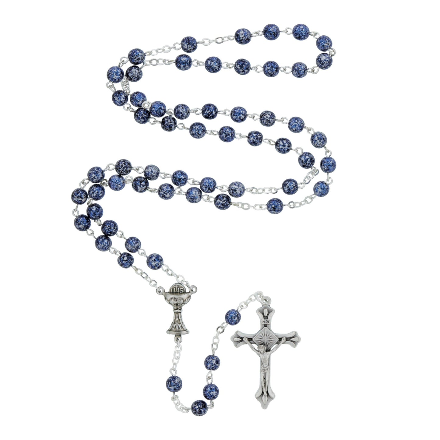 The unique glass beads of this rosary are painted a deep blue color with delicate silver speckles. The chalice centerpiece and sunburst at the center of the crucifix add a special touch. Comes with a sweet laminated prayer card with a First Communion blessing on the reverse side: “As you receive the body and blood of Jesus into your life, heart and soul, may He be your Shepherd and guide you on your way. May Jesus bless you as you walk through life’s journey.”