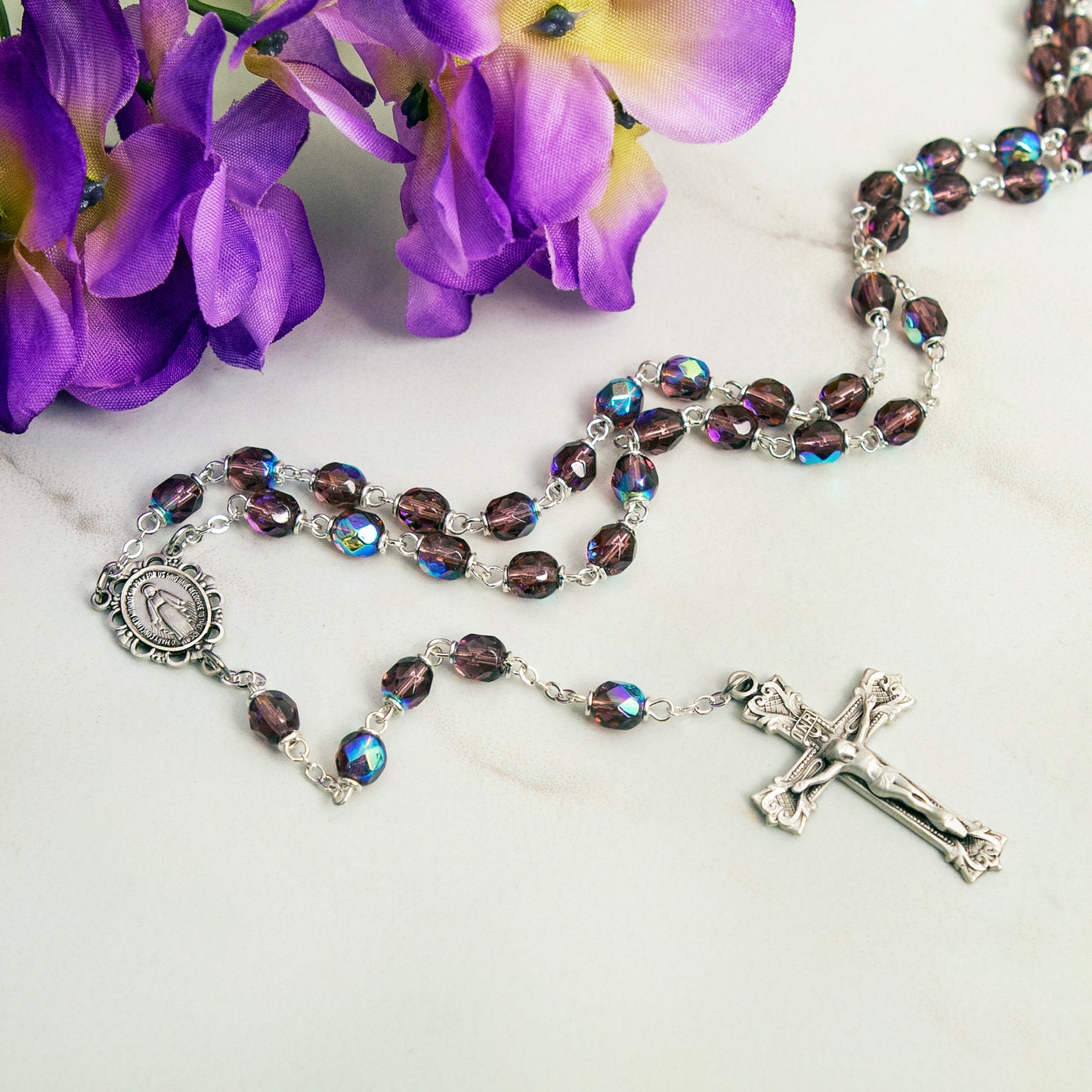 Choose this rosary as a special birthstone rosary, or just because you love its amythyst lustre. This February birthstone rosary is made with fire-polished aurora Bohemian glass beads for an extra-lovely sparkle. This light purple rosary also features a decorative sterling silver Miraculous Medal center and a sterling silver Crucifix. This rosary is designed to be a cherished keepsake, and would make a great gift for anyone with a February birthday.