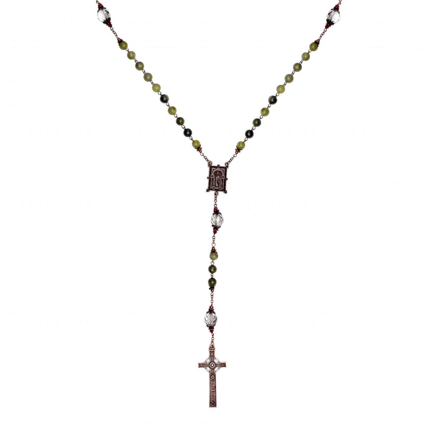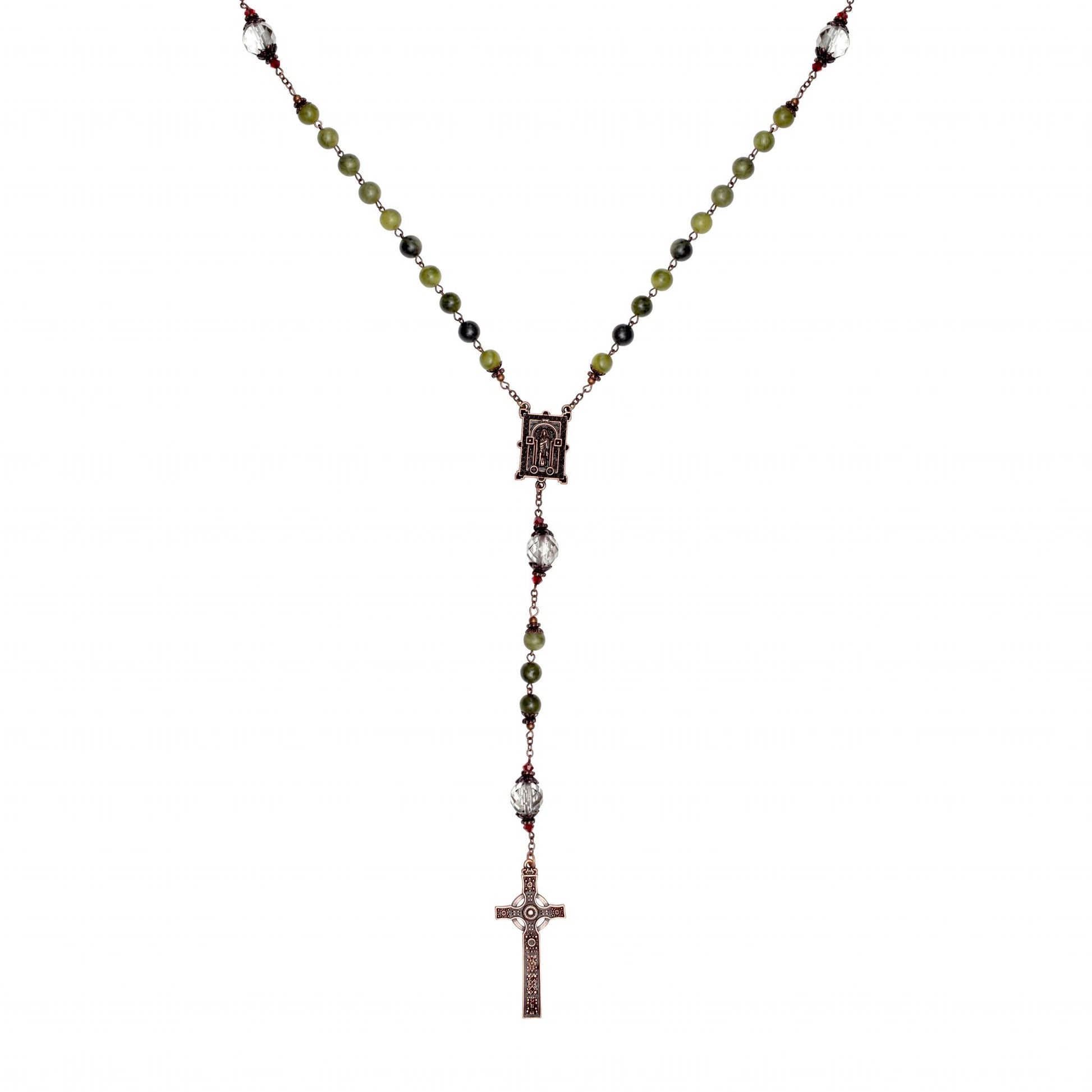 An attractive and elegant rosary features rich, round Hail Mary beads made of genuine Connemara Marble in deep greens. Our Father beads are luminous, faceted, clear crystals, flanked by elegant copper finished brass caps and burgundy bi-cone crystal spacers that add movement and depth.