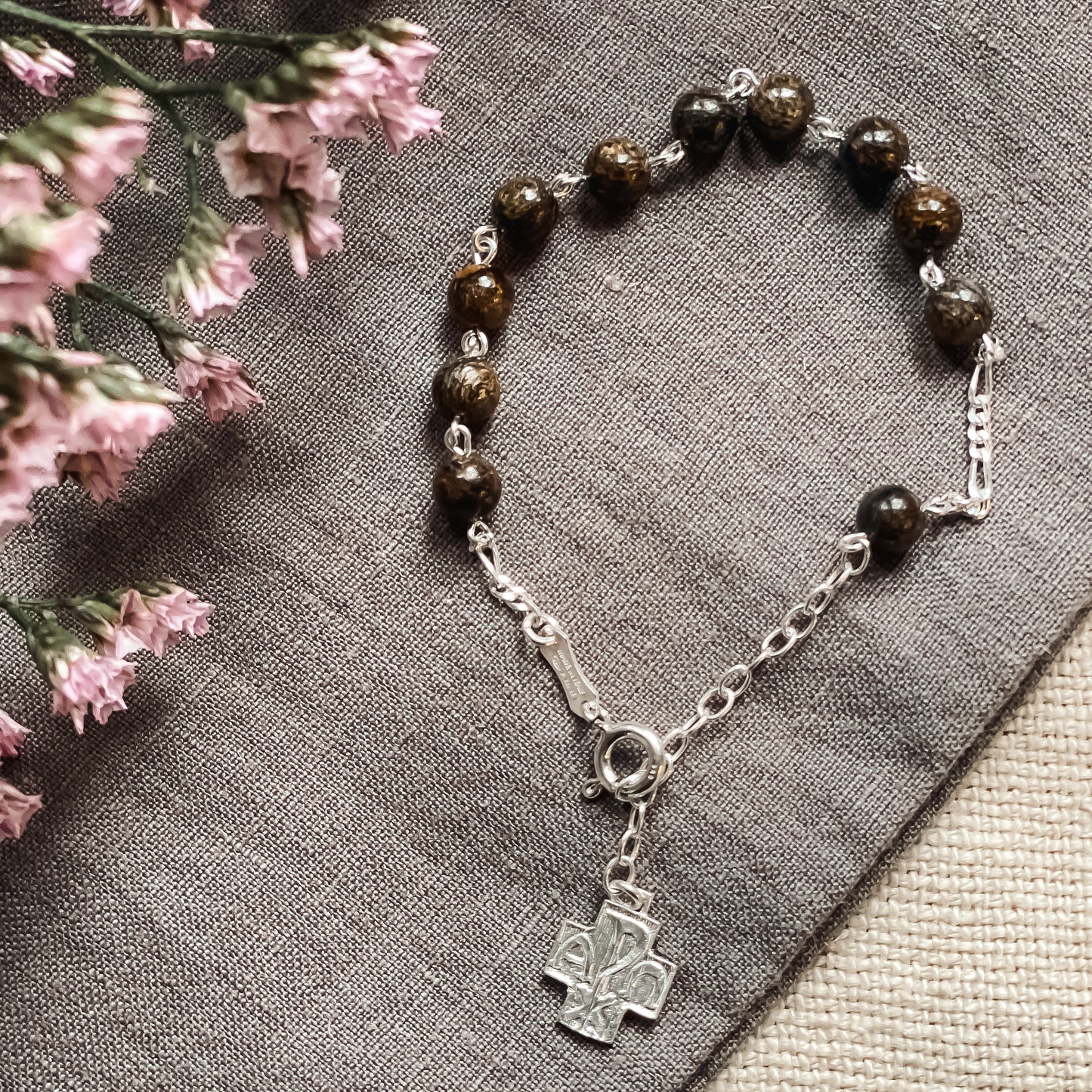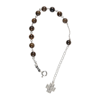 A striking rosary bracelet made of richly speckled bronzite, with deep ebony stone flecked with bronze tones features a contemporary Chi Rho Cross in sterling silver as the finishing touch. A distinctive gift of faith and prayer, it's also a versatile accessory you can wear every day. Wear and share your faith, and take Our Lady's Rosary with you wherever you go. Made in Italy. Note: Personalization, if added, will be engraved on a silver charm attached to the bracelet.