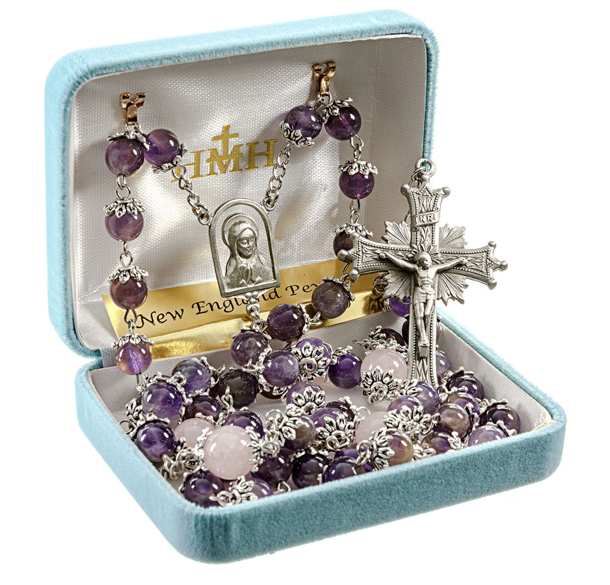 This graceful rosary is made of amethyst gemstones in pale pink to rich violet hues. Our Father beads are large, polished pink amethyst and Hail Marys are rich violet amethyst. Each bead is elegantly and delicately capped with a silver tone floral bead. Silver tone links and accents bring a striking and rich contrast when paired with the gemstones. The centerpiece features a Praying Madonna arched cutout medal. The finishing touch is a gorgeous sunburst Crucifix that is ornate and striking. This is a feminine rosary to celebrate her faith and her devotion to Our Lady. The perfect gift for a woman you cherish.