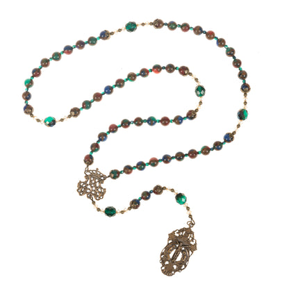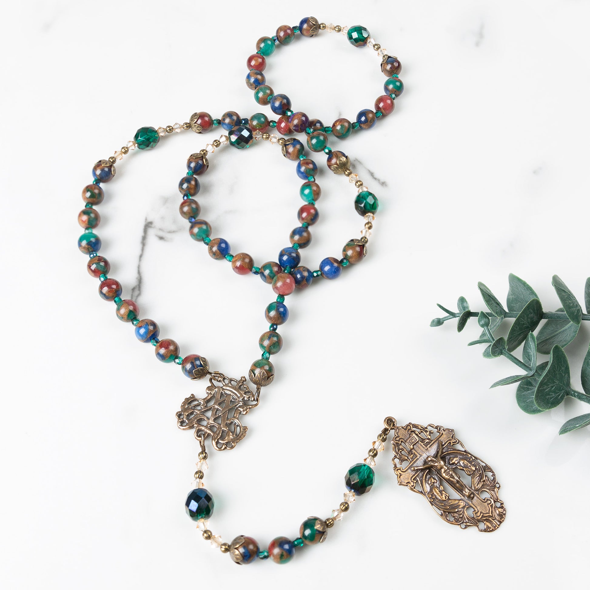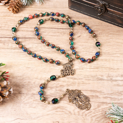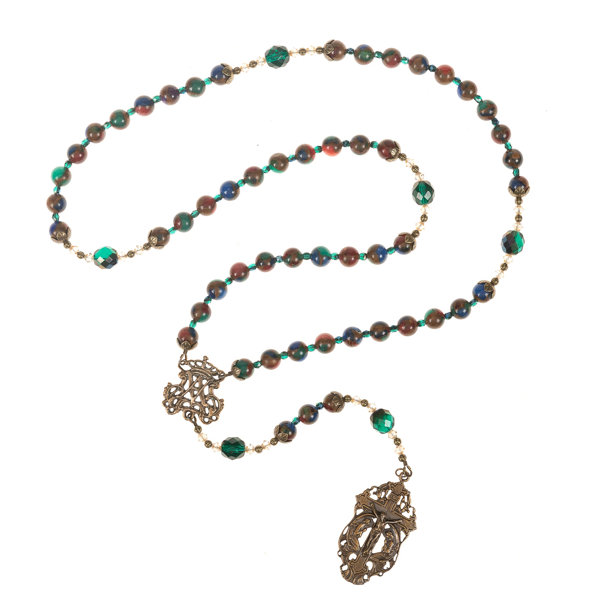 Our Father beads are Emerald Fire-polished Crystals. They are flanked by Golden Bi-cone Crystals and intricate, antique, brass beaded rondelles. Gorgeous, jewel-tone, Mosaic Quartz rounds bring the splendor of brilliant stained glass in a cascade of sparkle and light. They are separated by Blue-Green Fire-Polished Crystal spacers, with graceful antique floral caps marking the beginning and end of each decade.