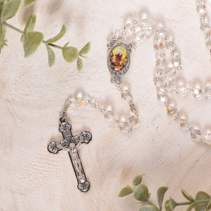 Use this gorgeous clear Czech crystal (five decade) rosary to pray the 100 Requiem devotion for the Holy Souls. The luminous rosary features a full color centerpiece of Our Lady of Mt. Carmel on the front and the Sacred Heart on the reverse.