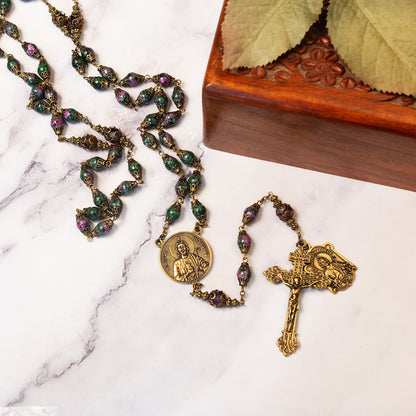 A handsome Collector's Edition Vintage Rosary, featuring genuine agate for the Our Fathers in green tones, flanked by elegant caps. The Hail Marys are double-capped rose crystals, accented by the antique gold finish, bringing special brilliance. The centerpiece is a distinctive, round medal of St. Jude Thaddeus, and the Crucifix is ornately fashioned with elegant metal work.