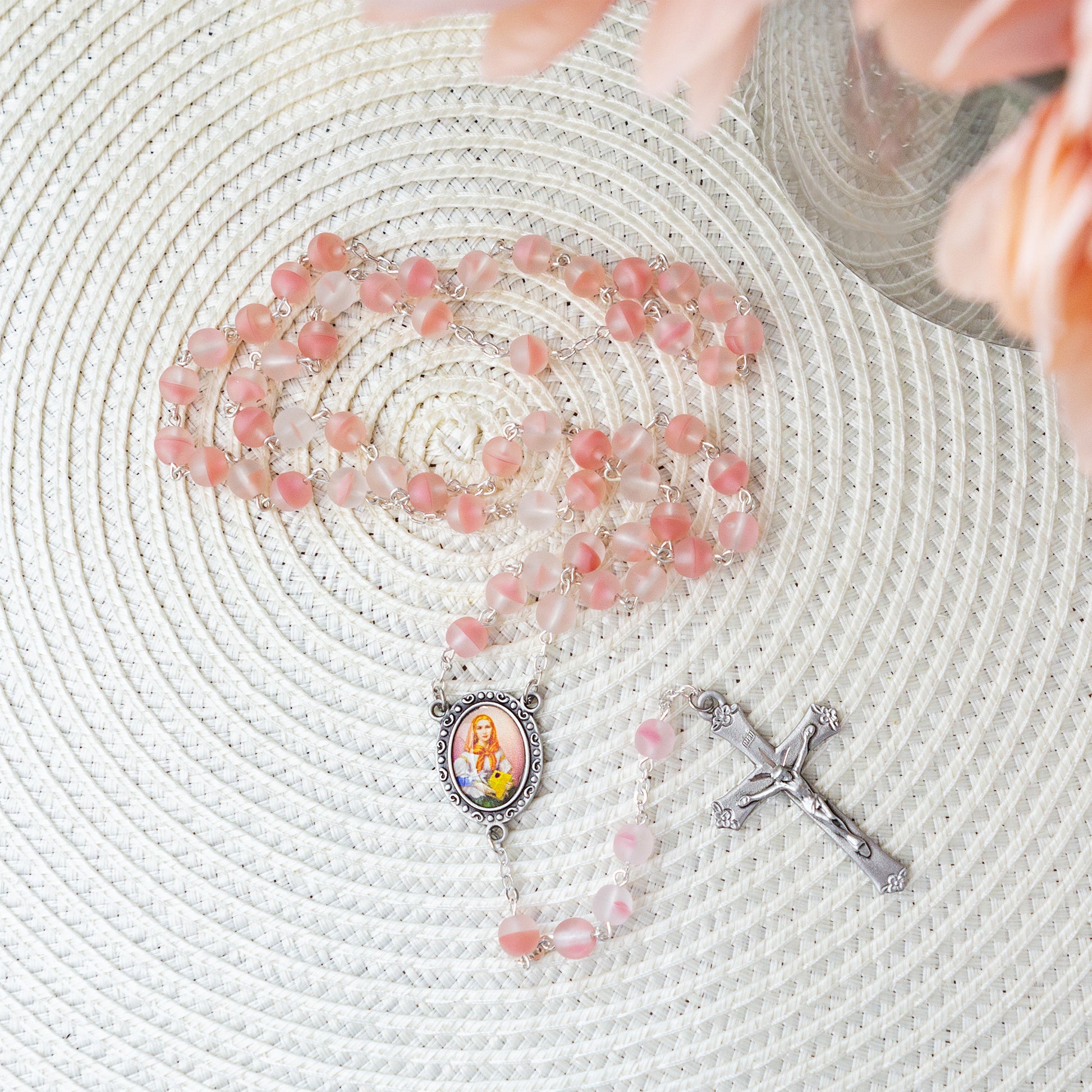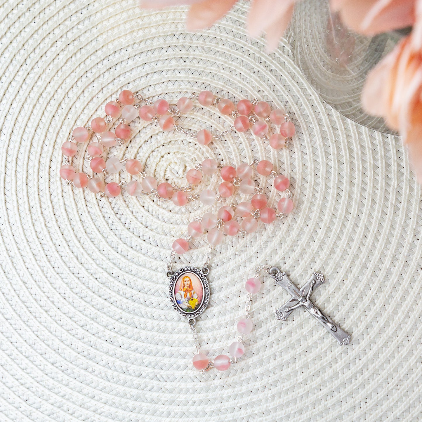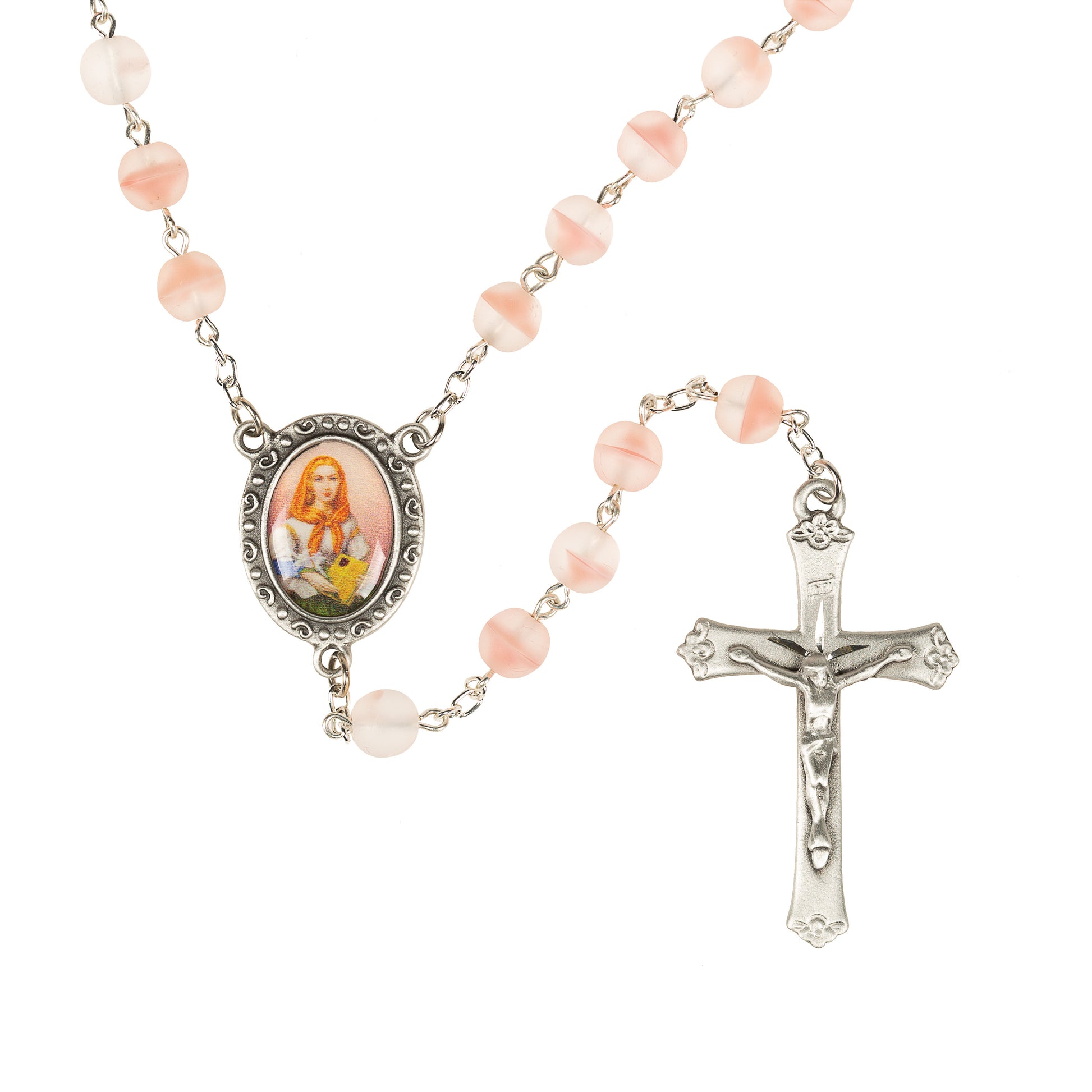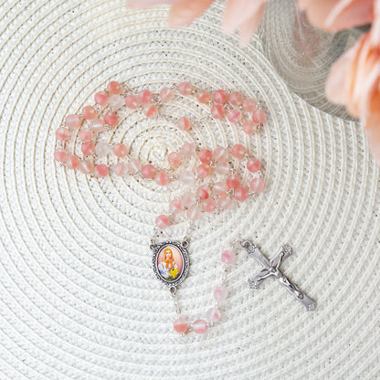This bright and feminine Rosary honoring St. Dymphna, Patron Saint of Those Suffering Mental Illness or Nervous Disorders features striking beads in vibrant coral pink tones, with a milky matte finish and subtle white swirls that add depth and richness. The centerpiece is a full color, traditional image of the saint, and the Crucifix features floral tips on each end for an added touch of femininity and grace. A meaningful and lovely gift for anyone suffering from anxiety, depression, or another mental illness and a thoughtful gift of faith for those who suffer disorders of the nervous system.