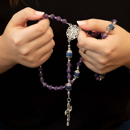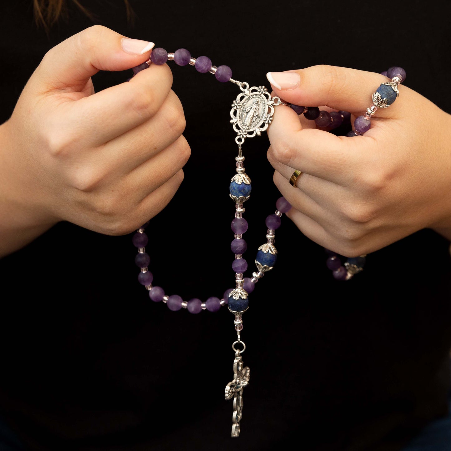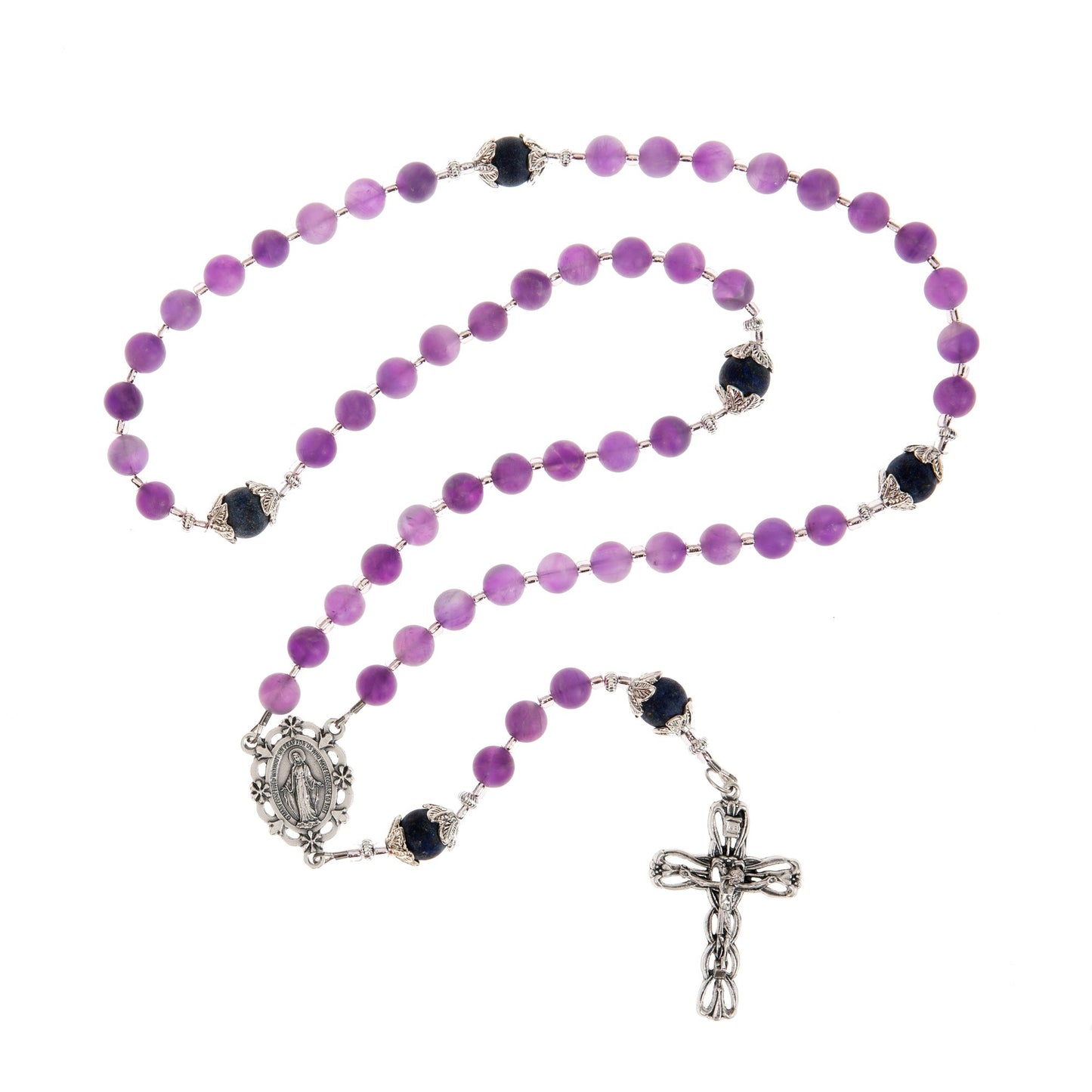 This handmade rosary celebrates the royal beauty and splendor of our Most Holy Mother as Queen of Heaven and Earth. Deep violet, matte amethyst Hail Mary beads are separated by silver lined, pale pink spacers, representing her regal grace and her feminine purity. Midnight blue, matte lapis Our Father beads symbolize the depths of the universe, and her Queenship and love throughout all of time. Gorgeous silver caps shaped like leaves represent her openness to God's will and His plan for our salvation.