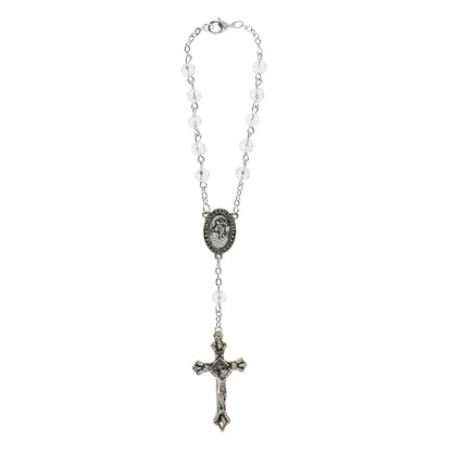 This crystal auto rosary reminds you to call on the help of St. Christopher and the Blessed Mother whenever you hop in the car. Perfect for hanging from the rearview mirror, it features a lobster clasp for ease of access, making it a handy way to keep track of your prayers wherever you go.