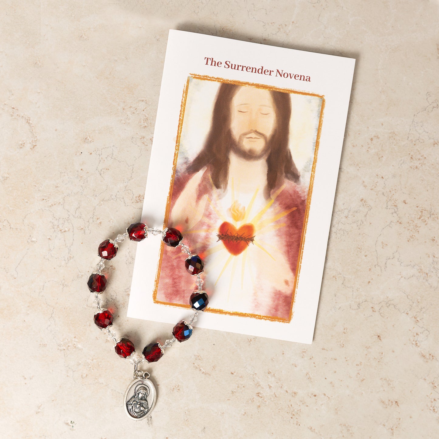 Use the Surrender Novena Chaplet to pray the Surrender Novena given to Fr. Dolindo Ruotolo by Christ Himself. The novena encourages us to surrender ourselves to Him, so that He can "take care of everything." This gorgeous handcrafted chaplet features regal burgundy Czech fire-polished crystal beads with blue iridescence, faceted to reflect the light brilliantly. They are a reminder of the flames of His love for us.
