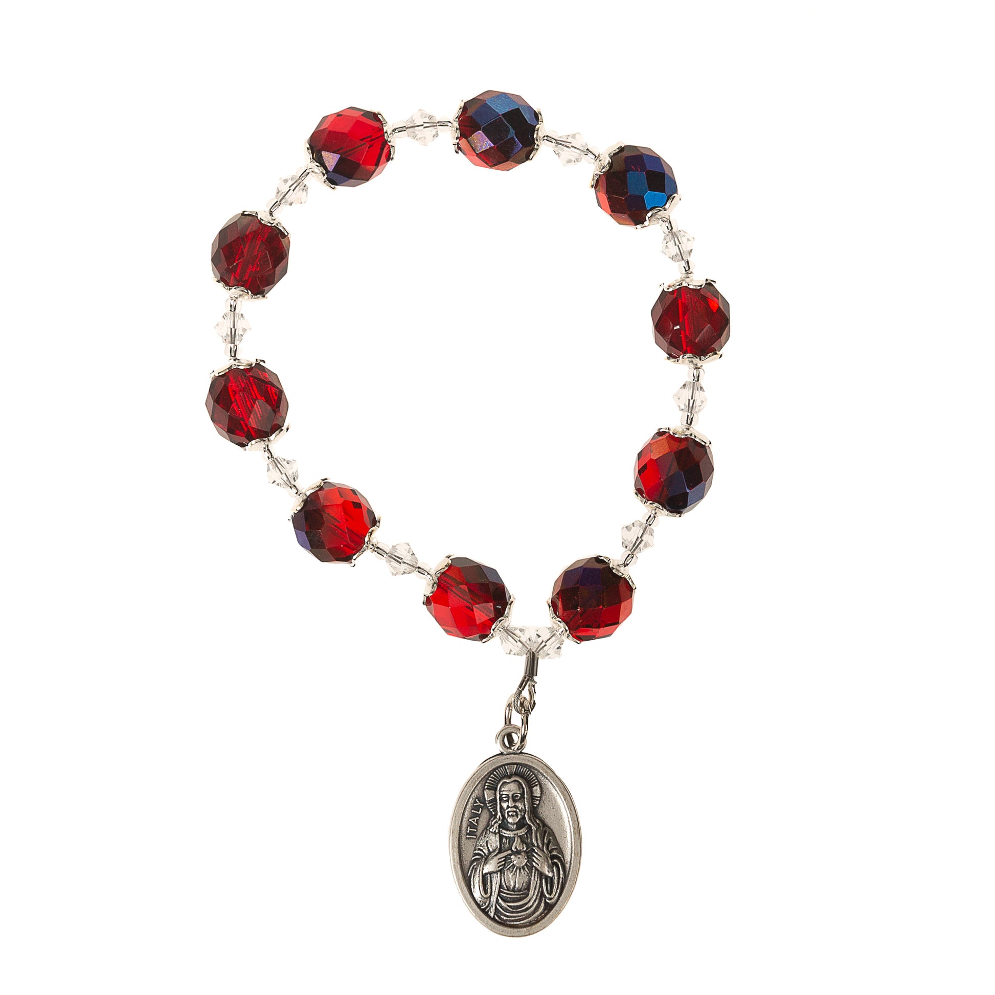 The generously sized beads are flanked by graceful, silver plated, floral caps and silver seed beads, as well as clear crystal bicone beads. A handsome Sacred Heart medal made in Italy of oxidized silver completes the devotional Chaplet and allows you to relieve your heart by calling upon His.