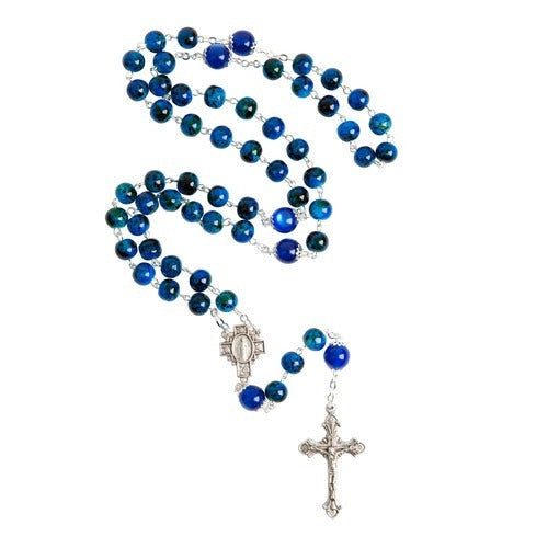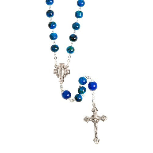This substantial Italian rosary features marbled shades of blue with elegant, capped glass Our Father beads. The oxidized silver crucifix matches the unique cross-shaped centerpiece, which features a Miraculous Medal inset. The Crucifix is equally ornate. A beautiful gift of faith for any occasion, especially a sacrament like Confirmation or RCIA. Display on a wall, table, or home altar to encourage daily prayer and meditation on the lives of Our Lord and the Blessed Mother.