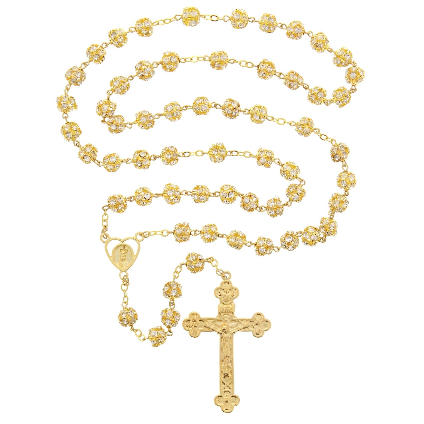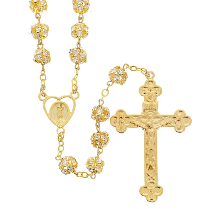 Gold tones and small crystals which catch the light combine into a truly striking rosary dedicated to Our Lady of Fatima. The lightweight, textured beads sparkle and remind us of the radiance of Our Lady during her apparition and also of the miraculous dancing sun. The centerpiece is in the shape of a heart with an image of Our Lady of Fatima wearing her crown. The Trinity Crucifix features God the Father at the top, an adoring angel, the Blessed Virgin Mary, and theĀ Host and Chalice. A gorgeous gift for anyone with a special devotion to Our Lady of Fatima.
