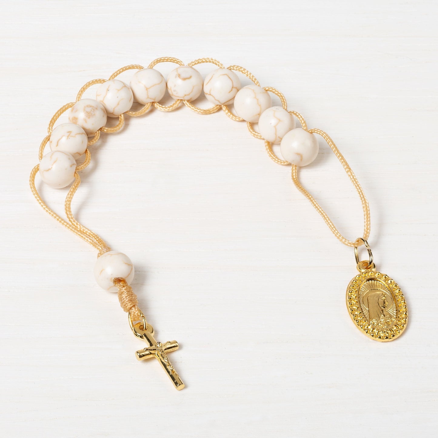 Slip this Our Lady of Fatima tenner into your pocket to take with you on-the-go! It is a great reminder of Mary’s request that we make sacrifices and reparation for our sins and the conversion of sinners. A small crucifix on one end is where you start your prayers. The medal on the other end of the tenner is a Fatima medal which shows an image of Our Lady and the children on one side and the face of Our Lady on the reverse. The white magnesite beads on this rosary remind us of Our Lady’s purity and beauty, appearing as “A woman all in white, more brilliant than the sun”. Use this tenner to keep track of small acts of love or sacrifice throughout the day, or as a one decade rosary.