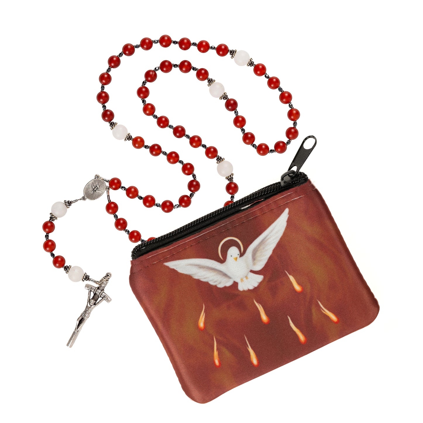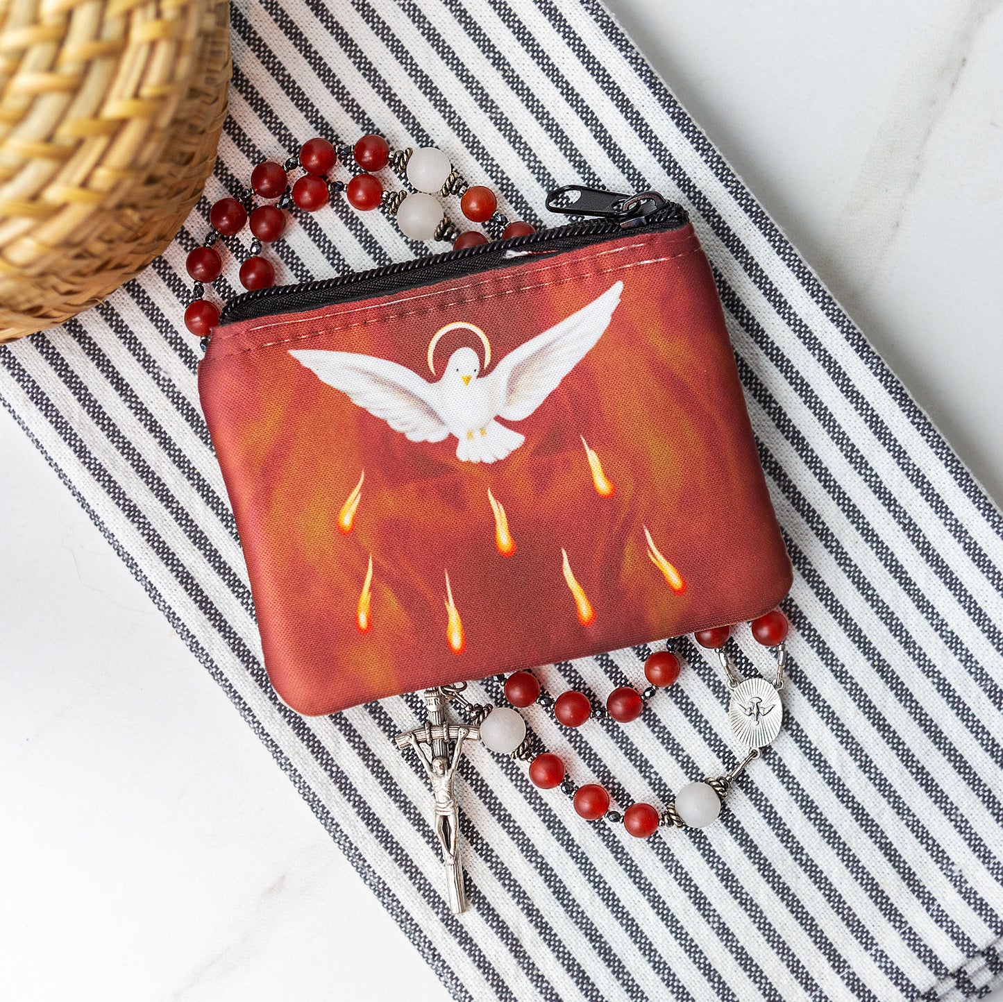 This rosary and rosary pouch are gifted together in this exclusive set to provide not only an exquisite rosary but with it a zipper closure rosary pouch. These two items are a perfect match as the fiery red and matte white colors from the rosary beautifully reflect the rosary pouch which depicts the white dove resembling the Holy Spirit sending down tongues of fire. This image is a beautiful reflection of the glorious events at Pentecost when disciples were filled with the Holy Spirit and began to speak in tongues. Beseech the Holy Spirit to enter into your life and give you the necessary inspiration and vigor to preach the Gospel. Keep this beautiful rosary safe and secure in this rosary pouch which fits in any pocket, purse, or backpack. We are offering free personalization for the pouch so you can make it a special gift for RCIA or Confirmation.