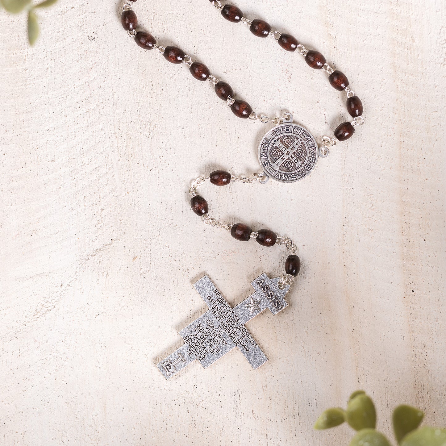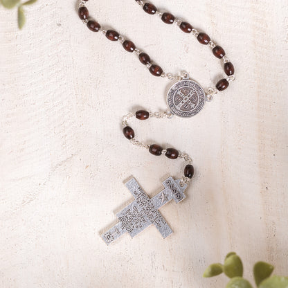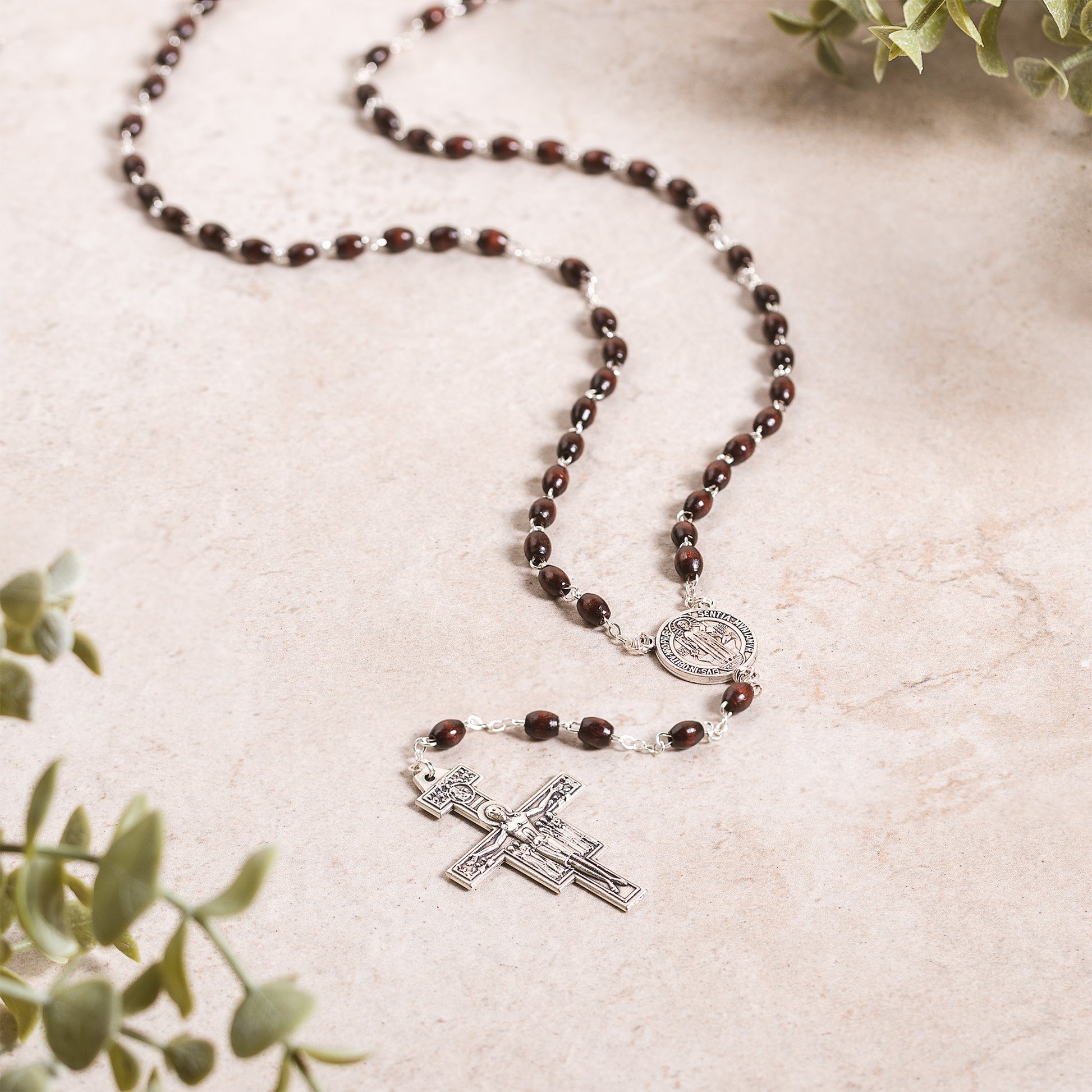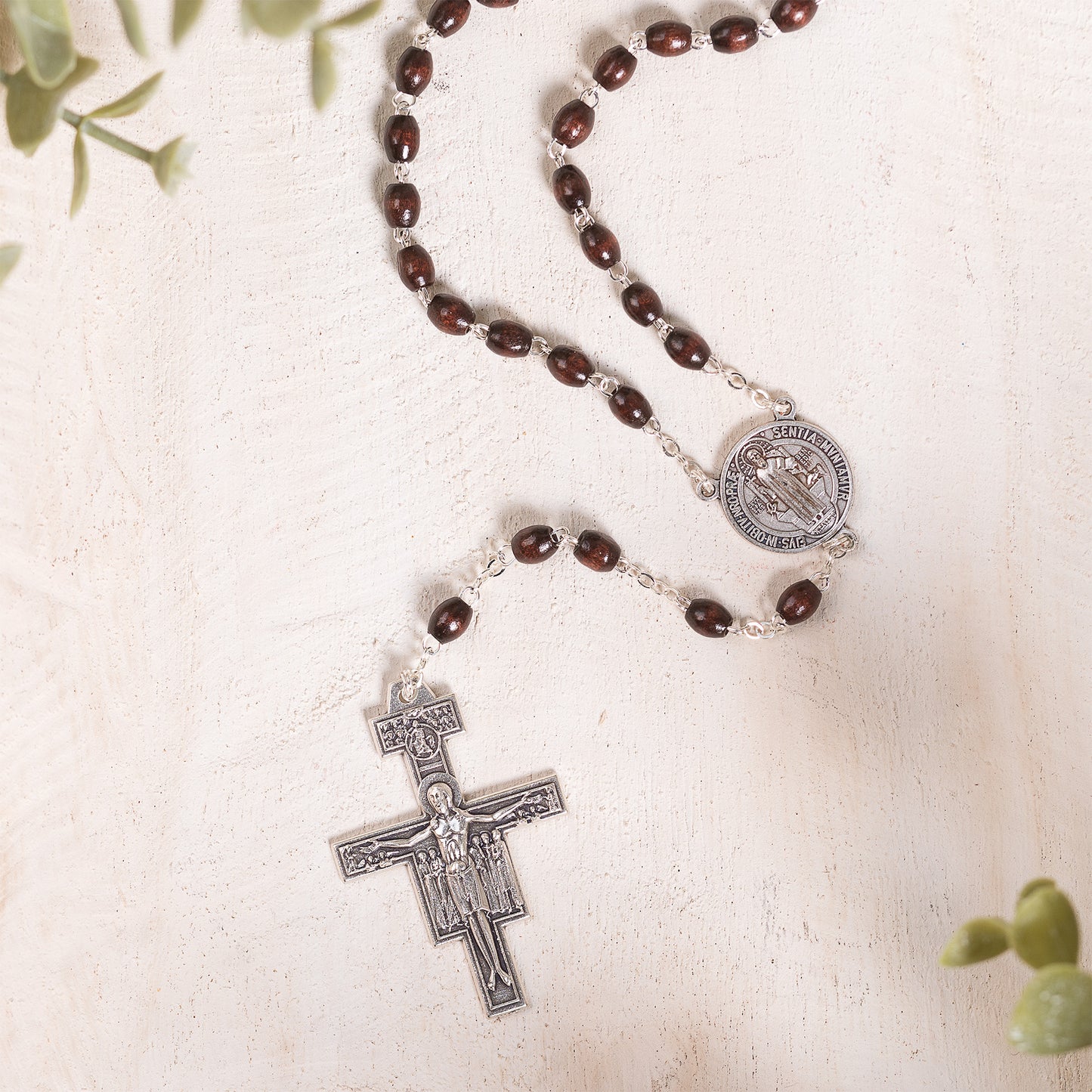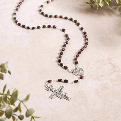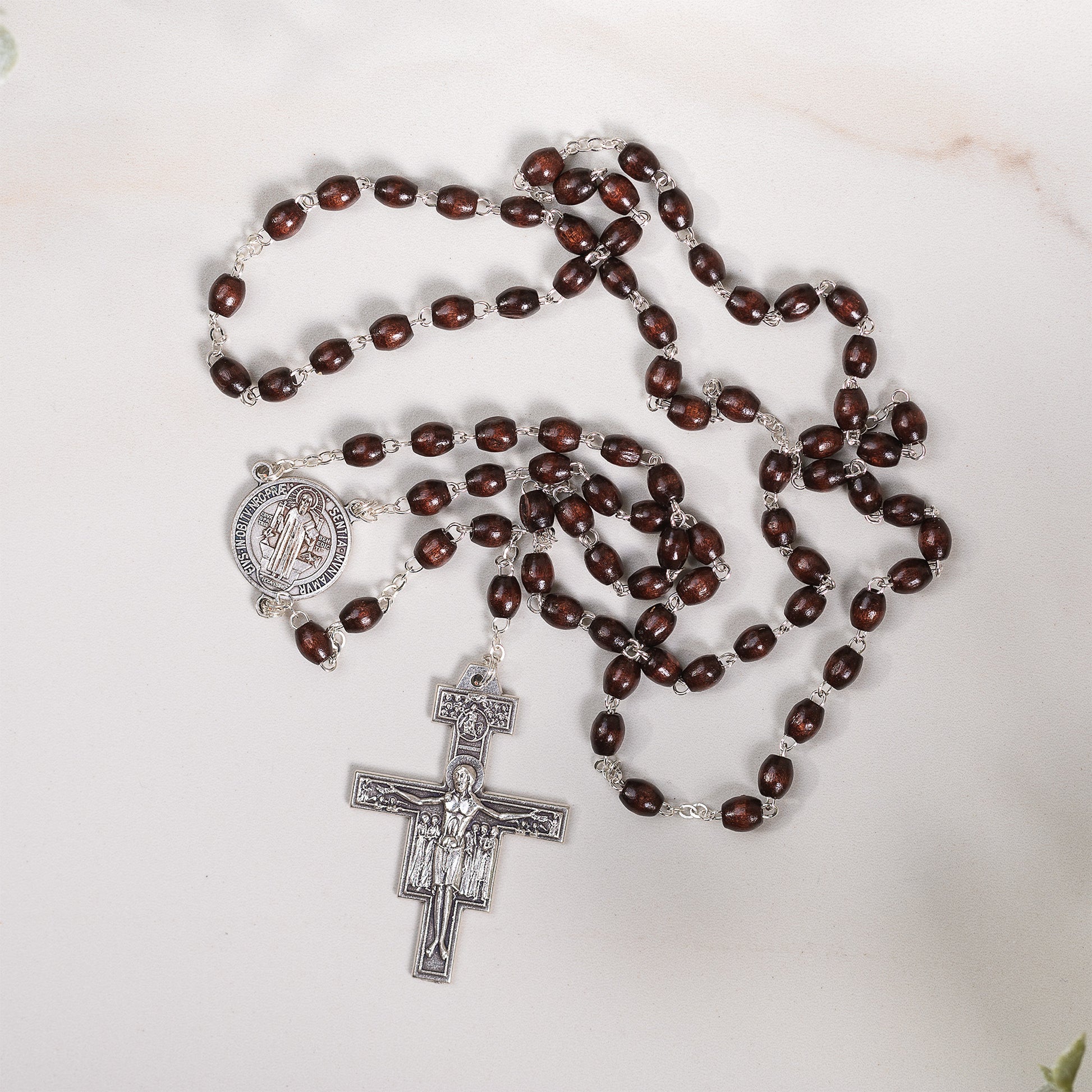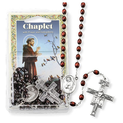 The rich, dark wood rosary features oblong beads, an oxidized silver St. Francis center, and a handsome San Damiano Crucifix. It's packaged with a prayer card and instructions.