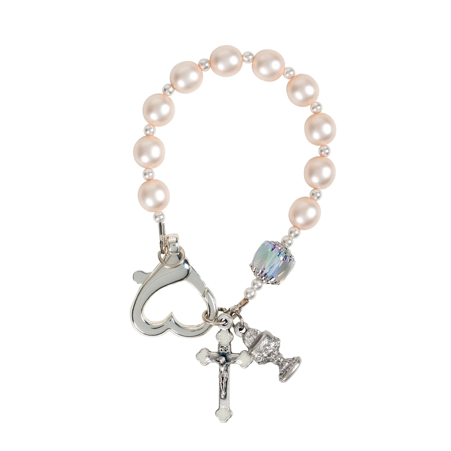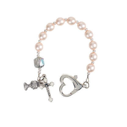 Celebrate her First Holy Communion with a gift that will become a remembrance of her special day. This handcrafted Rosary Bracelet features generously sized, creamy glass pearls for the Hail Marys, separated by petite pearl accent beads. The Our Father bead is a gorgeous, capped, Czech Cathedral Glass Crystal in pale blue, as a reminder of Our Lady's protection and heavenly queenship. An oxidized silver Crucifix and Chalice charm made in Italy complete the lovely rosary tenner bracelet, and a heart-shaped clasp is the finishing touch. A gift she will cherish, and one that is sure to please a special young lady.