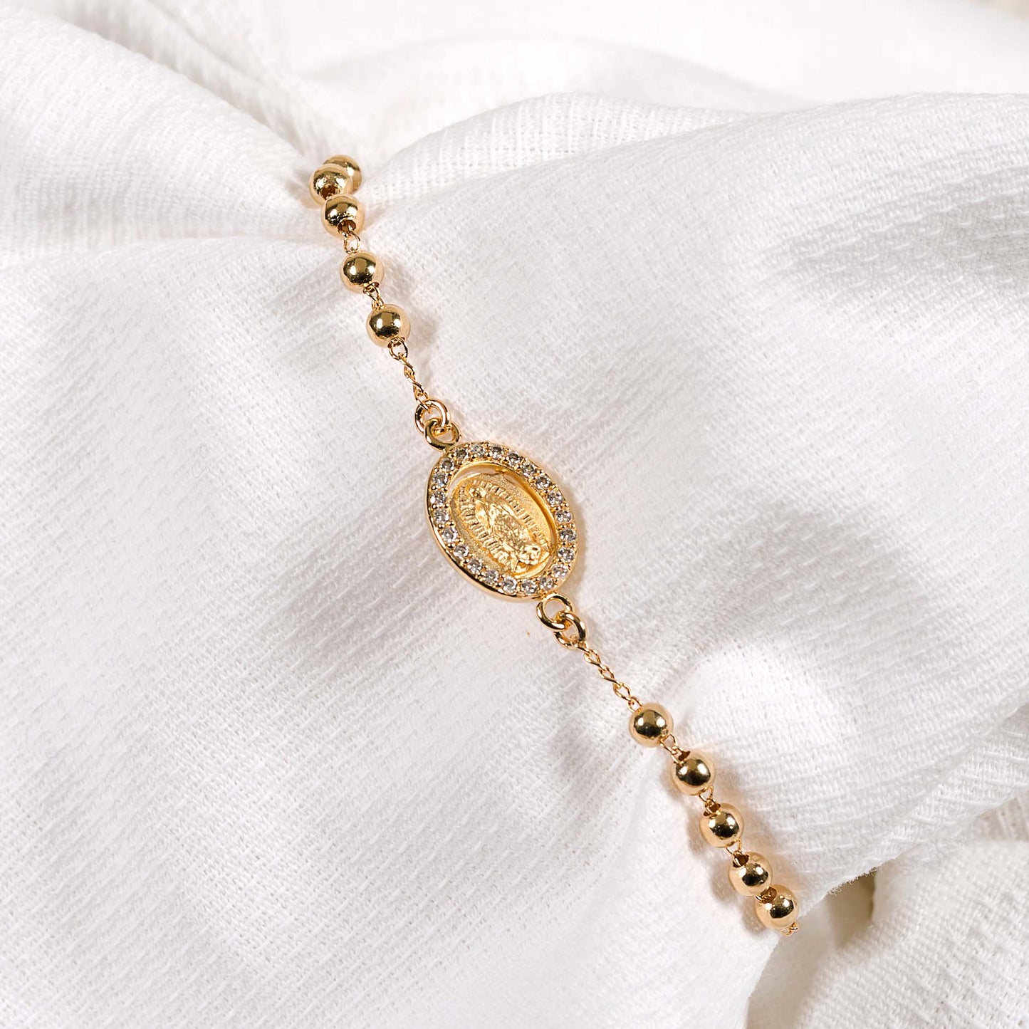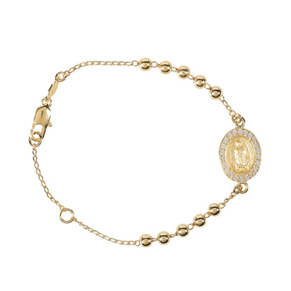 A special gift of faith and prayer for women devoted to the rosary, featuring a gold chain with one decade of rosary beads. The beads are arranged so that five appear on either side of a lovely Our Lady of Guadalupe medal, with crystal accents around the oval border for a special feminine touch. A piece that blends faith and fashion for those devoted to Our Lady of Guadalupe, patroness of Mexico, the Americas, and the Unborn.