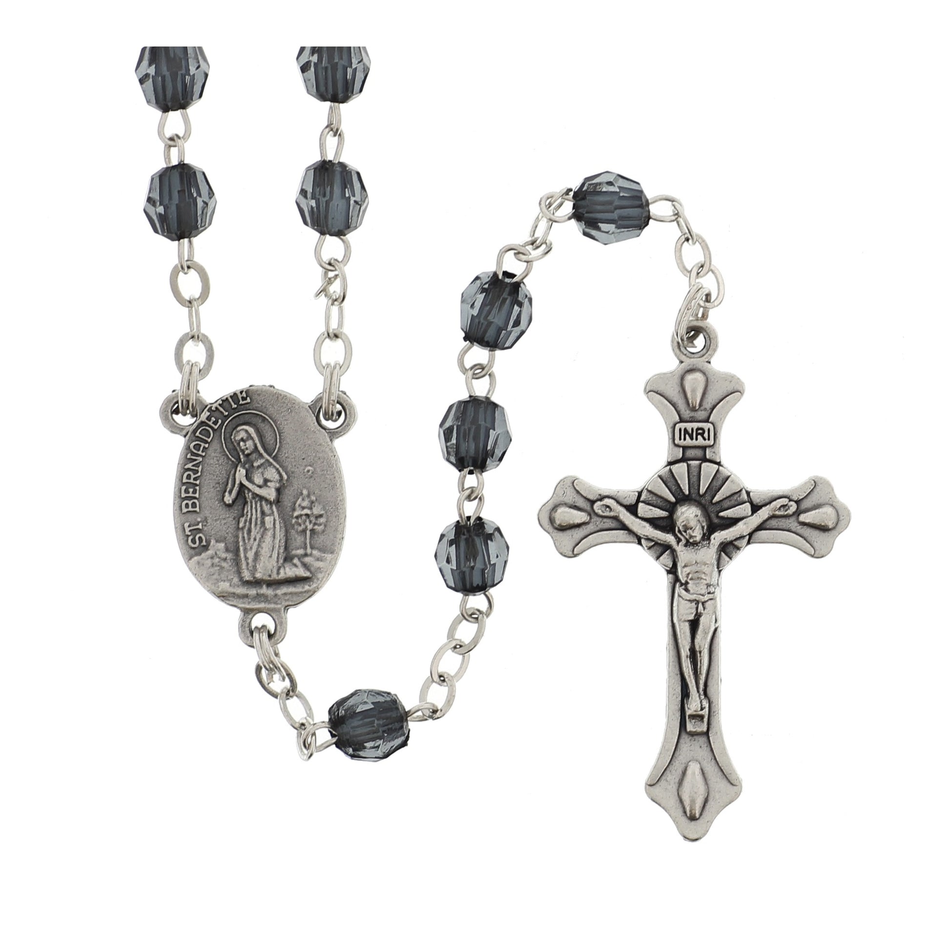 This lovely rosary features beads in a dusky grey color, representing the earth which St. Bernadette dug as Our Lady created the miraculous springs at Lourdes. Graced by a silver crucifix, this makes a fantastic gift of devotion to anyone who loves Our Lady of Lourdes or St. Bernadette. The centerpiece depicts Our Lady appearing to Bernadette on one side, and Bernadette herself on the other.