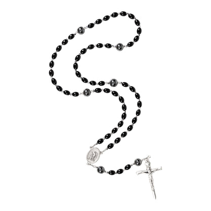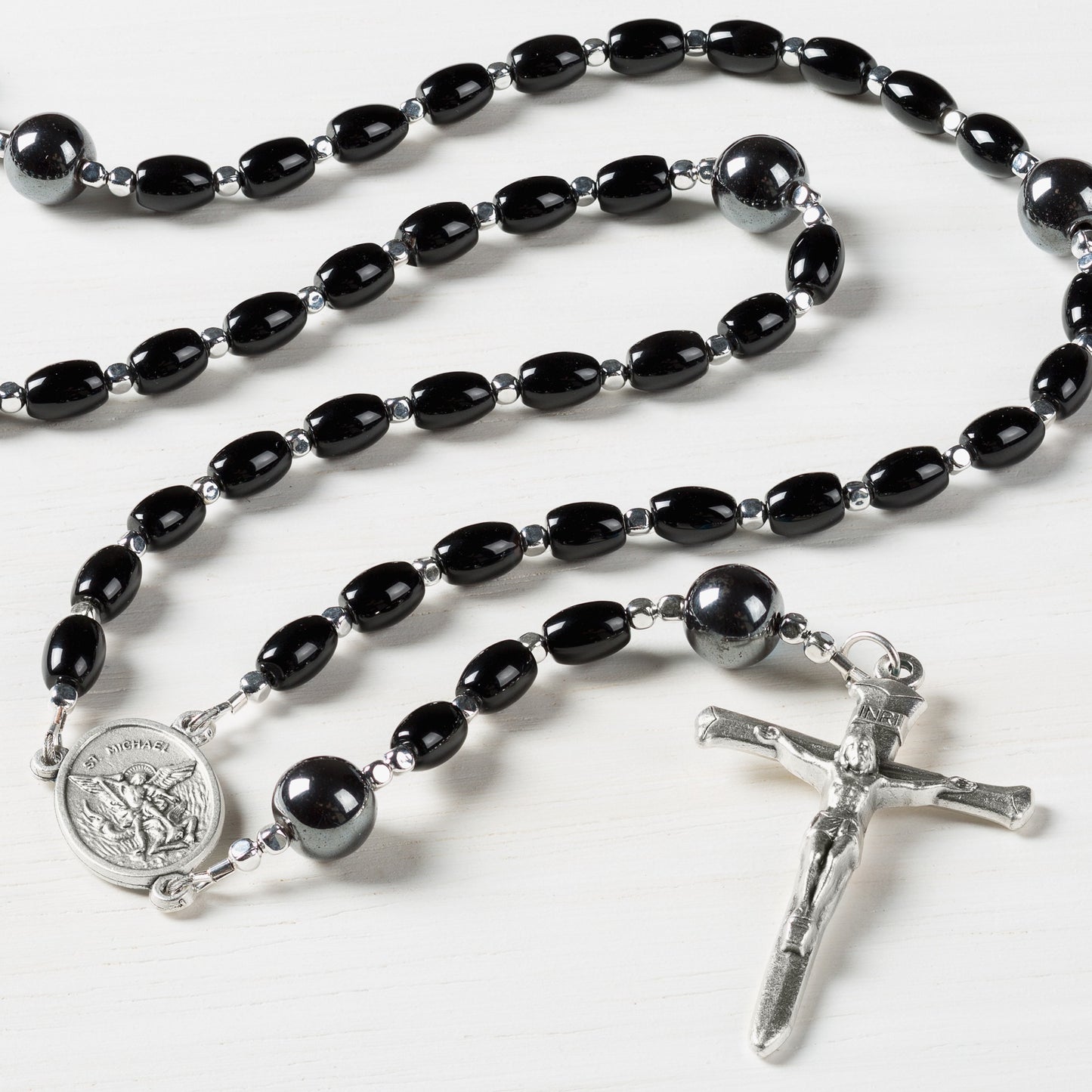 St. Michael the Archangel is our powerful defender against Satan and his temptations. He will be also be our guide after death as we appear before God for judgement. The rosary is often described as our best weapon against Satan, so a rosary dedicated to St. Michael is a mighty weapon indeed! This black onyx rosary reminds us of St. Michaelās unshakable resolve to serve God. The shiny hematite Our Father beads along with the metal St. Michael centerpiece and nail crucifix remind us of the scripture, āPut on the armor of God so that you may be able to stand firm against the tactics of the devilā (Ephesians 6:11).