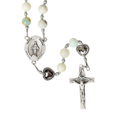 The cheerful blue-green and golden-orange hues of the flower amazonite beads inspire hope in the joy of the resurrection. These smooth, marbled beads glide under your fingers as you send up each prayer, and the crystal heart-shaped Our Father beads remind you to hold this special person ever in your heart. The crucifix, engraved with "In Loving Memory" on both sides and molded with a droplet accent, symbolizes the tears shed for the loss as well as the blood of Christ poured out for the salvation of this beloved soul. The Miraculous Medal centerpiece reminds you that Mary's maternal love embraces both you and your loved one. This handcrafted rosary makes a touching display at a funeral, and a prayerful bereavement gift that will encourage mourning friends and family to turn to the Lord in their grief. Includes a memorial prayer card.