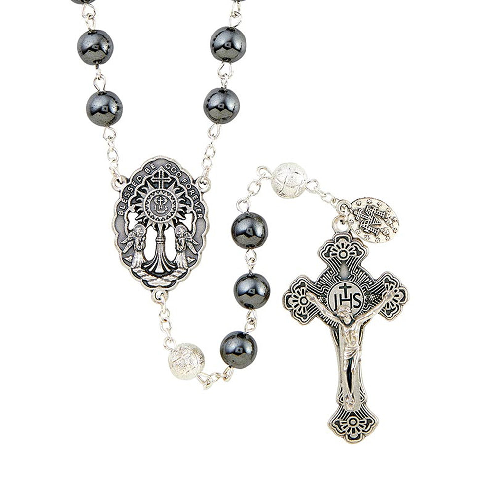 We invite you to experience this rich, hand-crafted treasure in a rosary honoring the Blessed Sacrament. It features Hematite beads, an ornate Eucharistic centerpiece, IHS crucifix and Miraculous Medal dangling charm. T