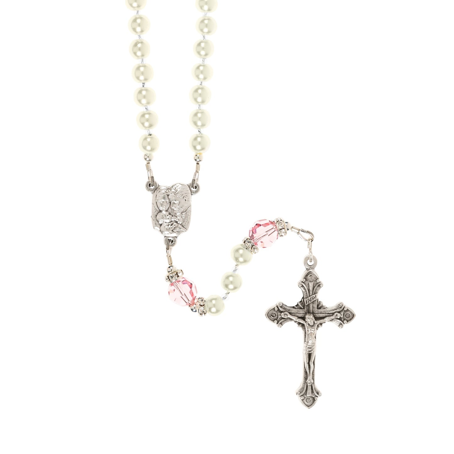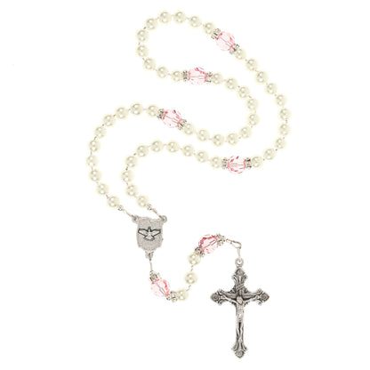 At the moment of Baptism the priest says the words, "I Baptize you in the Name of the Father, the Son, and the Holy Spirit". These words are commemorated by the beautiful Holy Spirit centerpiece on this keepsake Baptism rosary. The reverse of the centerpiece medal has a sweet image of the Holy Family - the infant Jesus, the Blessed Virgin Mary, and St. Joseph. A gorgeous rosary, the glass pearl decade beads are matched perfectly with the sparkle from the pink Swarovski crystal Our Father Beads and the little rhinestone rondelles. The centerpiece and crucifix are from Italy. A beautiful gift for the child, the mother, or the Godparents.