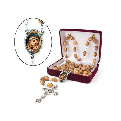 This lovely rosary crafted with care in the Holy Land of warm, rich olive wood, features oblong and graceful beads accented by silver tone findings. The centerpiece is an image of the Madonna & Child framed beautifully by a roped edge. The Crucifix is an elegant design, featuring Fleur-de-lis ends, to honor Our Lady and fine details to complement this attractive aid to prayer.
