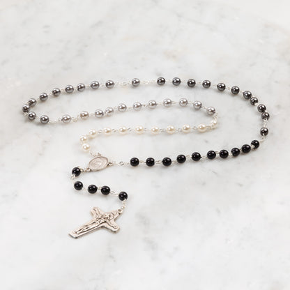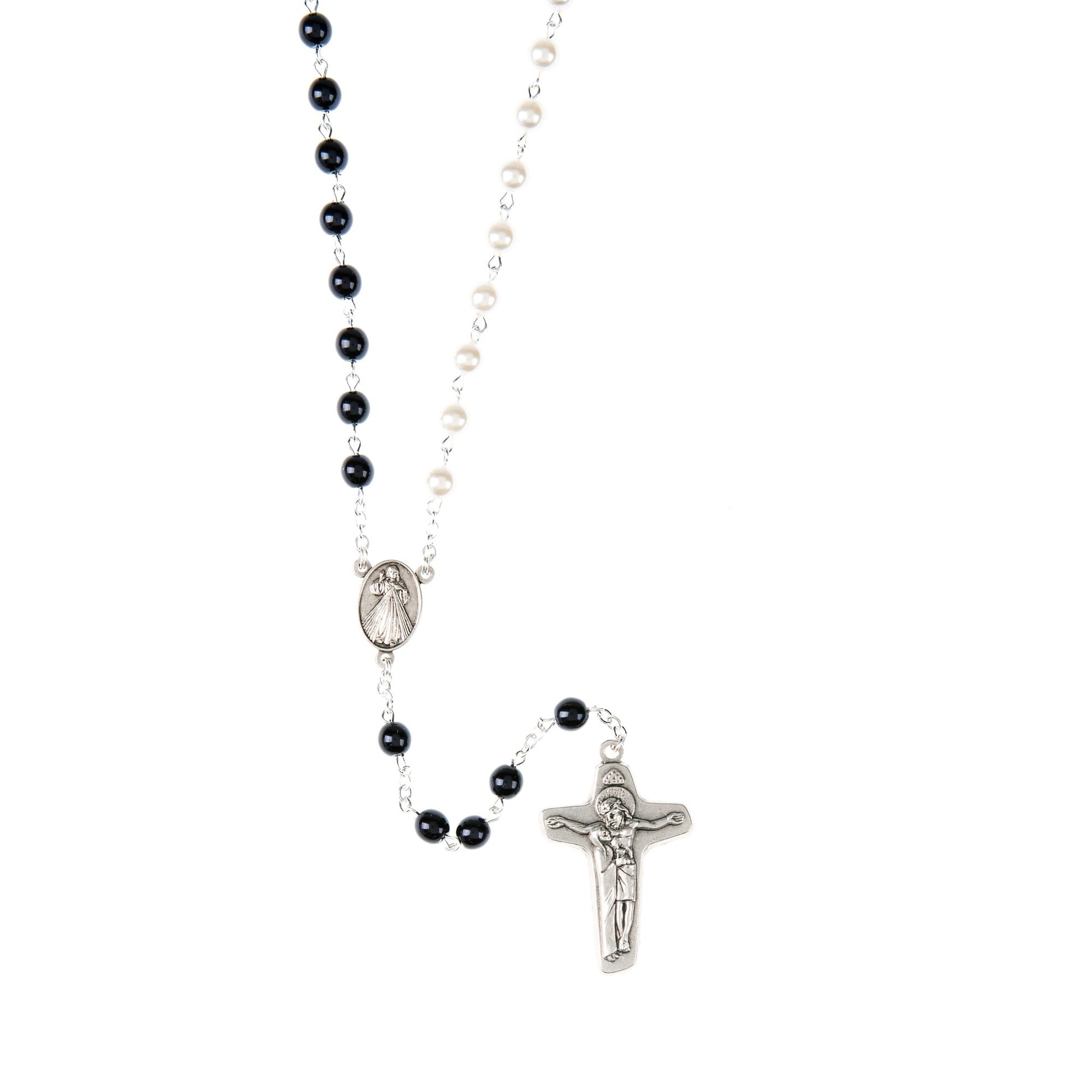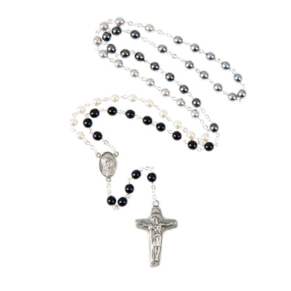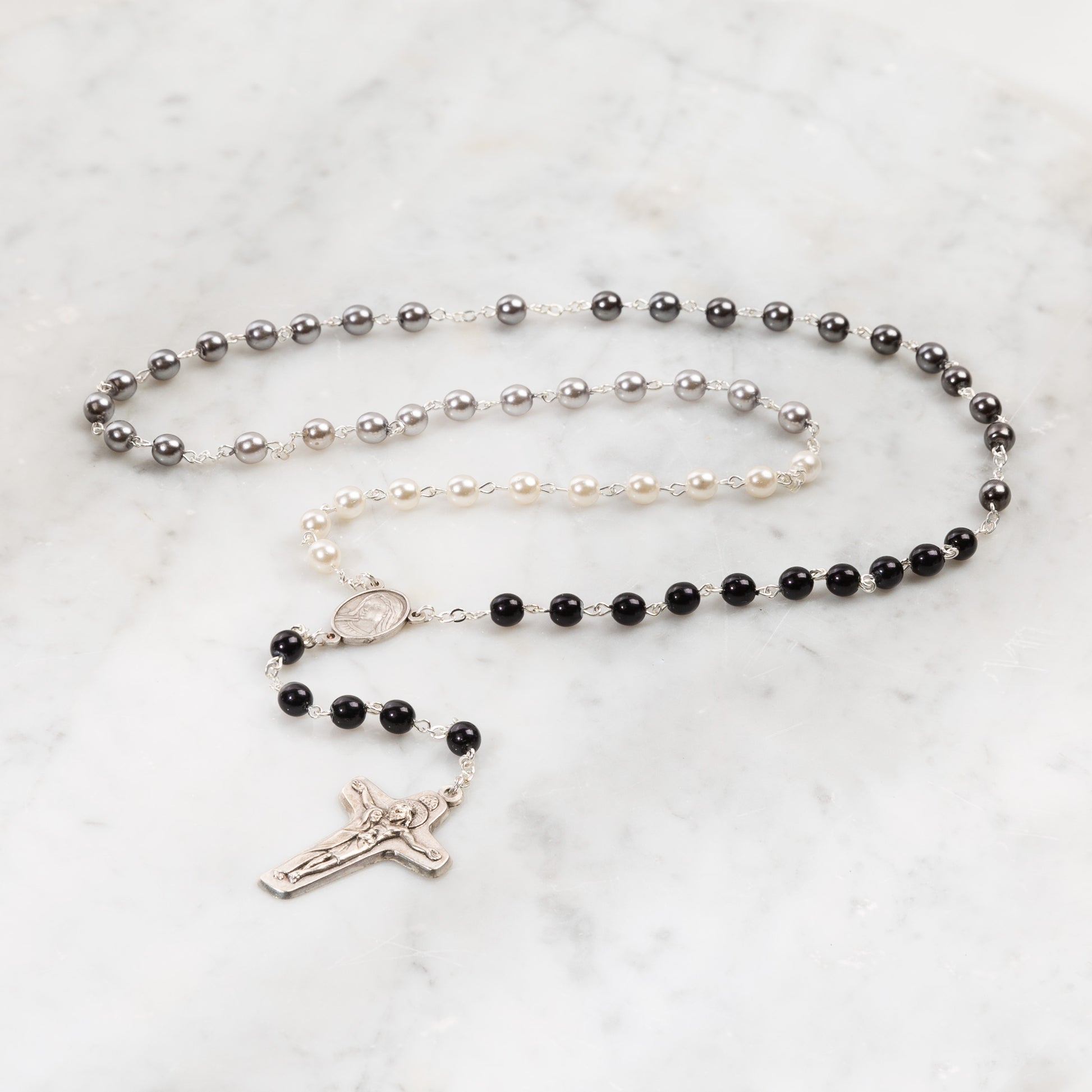 This striking rosary has been designed to encourage prayer for the souls in Purgatory. The colors of the rosary beads lighten from black to grey to white, representing the vision of Blessed Anne Catherine Emmerich in which she witnessed suffering souls change from dark to light as a result of her prayers. The unique crucifix depicts Jesus on the cross with the Blessed Mother at His side, holding up a chalice to receive His precious blood. The centerpiece displays an image of Our Lady on one side and the Divine Mercy on the other. This rosary is a beautiful reminder to pray for the Holy Souls, a great work of mercy encouraged by the Catholic Church. The month of November is especially given to prayer for the Holy Souls in Purgatory, and their feast is November 2nd.