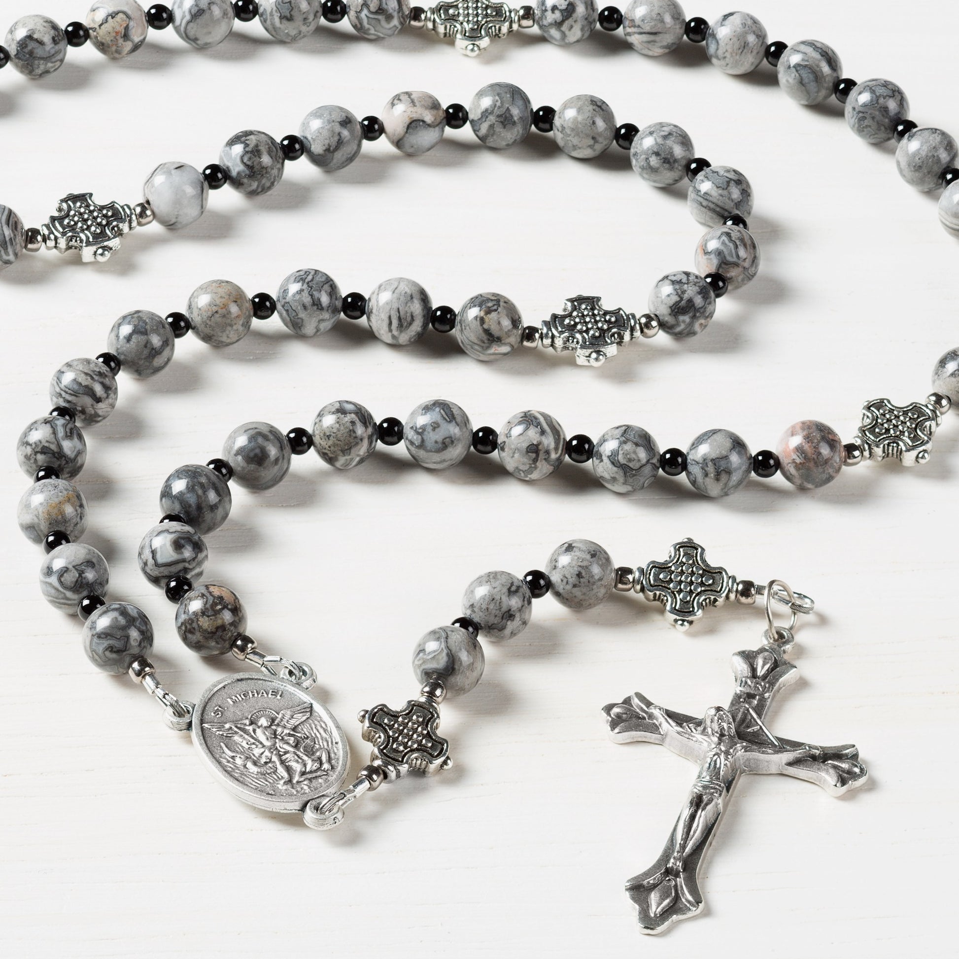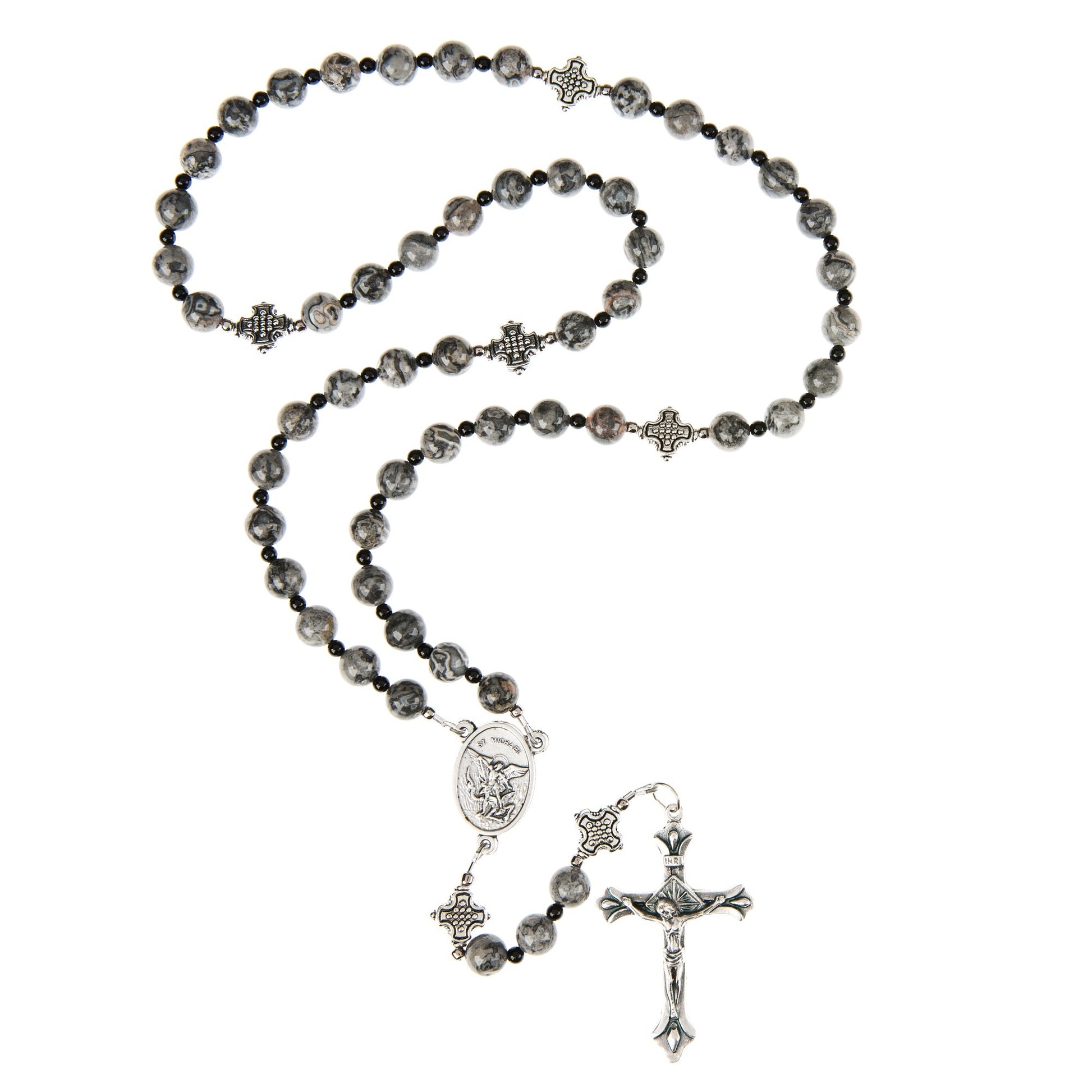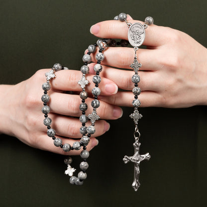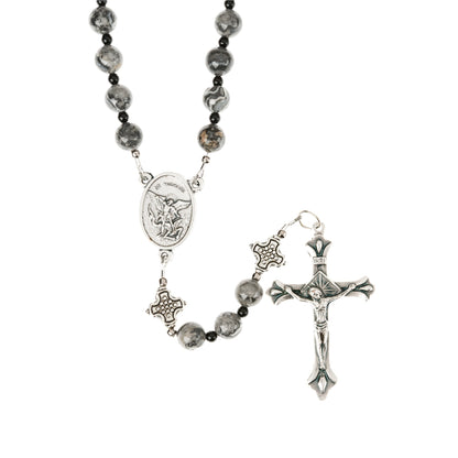 This rosary was designed to aid those who wish to offer special prayers for the Holy Souls in Purgatory. The shades of grays, white, and black on the "lace" agate stones remind us of Blessed Anne Catherine Emmerich's words and how helpful our prayers can be. Agate is an ancient stone that is listed in the Old Testament on the “Breastplate of Judgment” (Exodus 28:17-21) and is also listed as one of the gems found in the foundations of the New Jerusalem (Revelation 21:19-20 and Isaiah 54:11). The decades are separated by decorative cross Our Father beads and the centerpiece features an Italian St. Michael the Archangel medal.