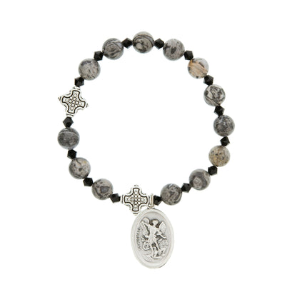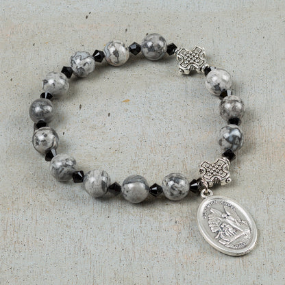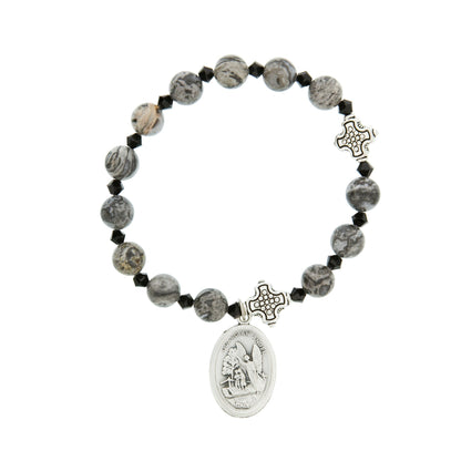 This rosary bracelet was designed to aid those who wish to offer special prayers for the Holy Souls in Purgatory. The shades of grays, white, and black remind us of Blessed Anne Catherine Emmerich's words and how helpful our prayers can be. Made with a stretch cord for comfortable wear, the beautiful marbled Agate beads are paired with Black Swarovski Crystals. The sections are separated by decorative cross beads and the centerpiece features an Italian medal with St. Michael the Archangel on one side and the traditional image of a Guardian Angel guiding children across a bridge on the other.