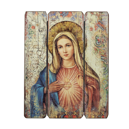 This beautiful image of the Immaculate Heart of Mary features soft, muted colors on a slightly-distressed finish. A vintage look, the image draws the eye and inspires devotion to the Blessed Mother. Bring a Marian touch to your home or any setting with this beautiful wall plaque.