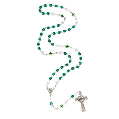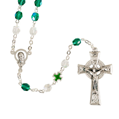 Express your beautiful Irish Catholic heritage with this unique Irish Rosary. The vibrant Our Father beads are metal crosses with green enameled accents. The iridescent green Hail Mary beads call to mind the lush green hills of Ireland, reminding you of the breathtaking country that produced so many saints and heroes of the Church. Follow in their courageous footsteps whenever you pray using this rosary, which is finished off with an elegant Celtic cross and graceful centerpiece.