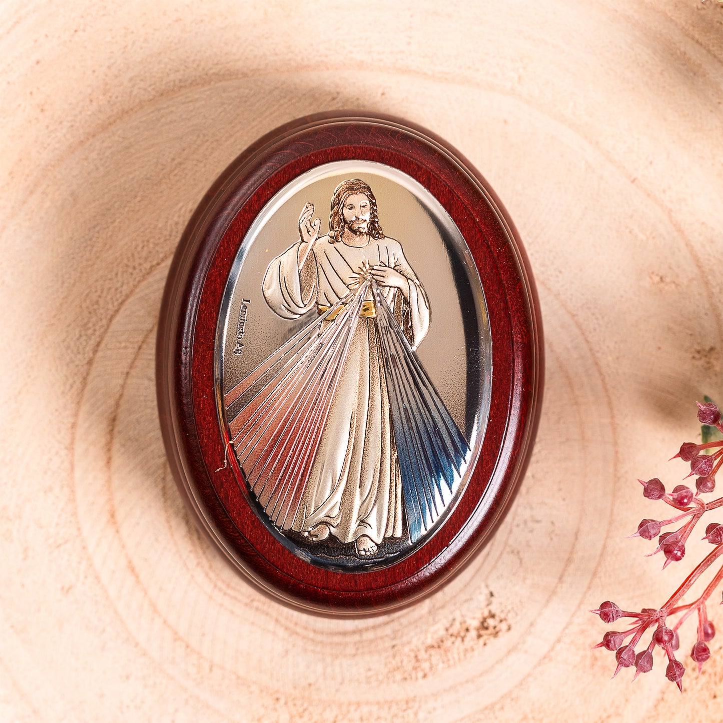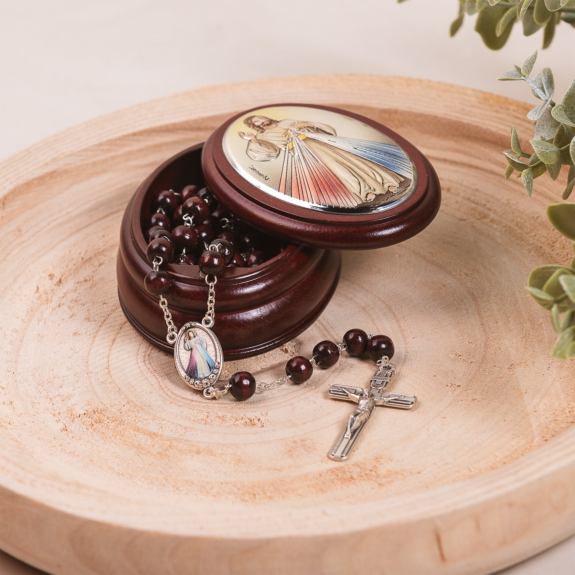 Give this small beechwood rosary box honoring Jesus in the Divine Mercy to someone you cherish. The smooth wooden box features a colored, metal accent on the lid bearing the image of the Divine Mercy.
