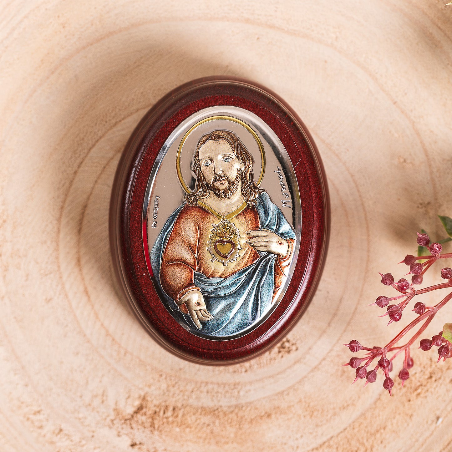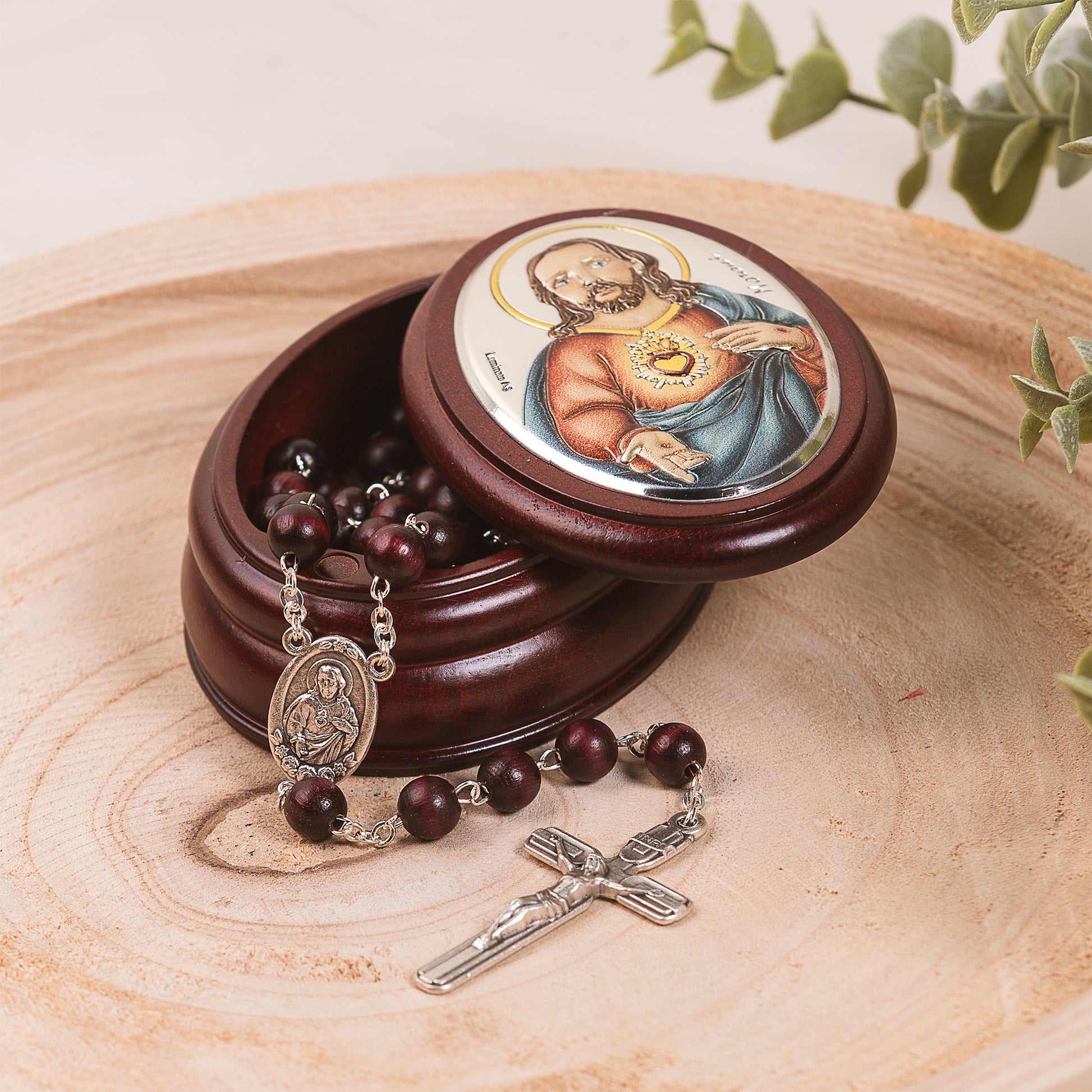 Give this small beechwood rosary box honoring the Sacred Heart of Jesus to someone you cherish. The smooth wooden box features a colored, metal accent on the lid bearing the image of His Most Sacred Heart.