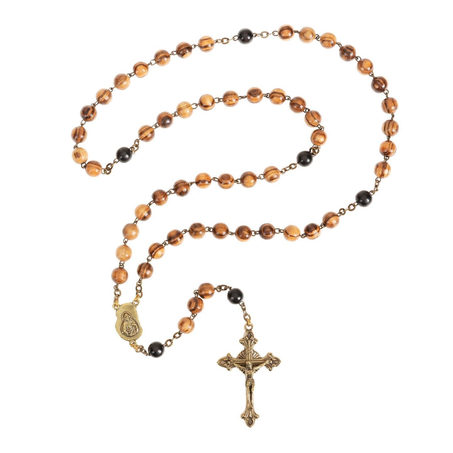 A warm wood rosary with striking gold tone accents features striped Hail Mary beads and dark Our Father beads, a Madonna and Child centerpiece featuring the Sacred Heart on the back, and a sunburst Crucifix in gold tone metal.