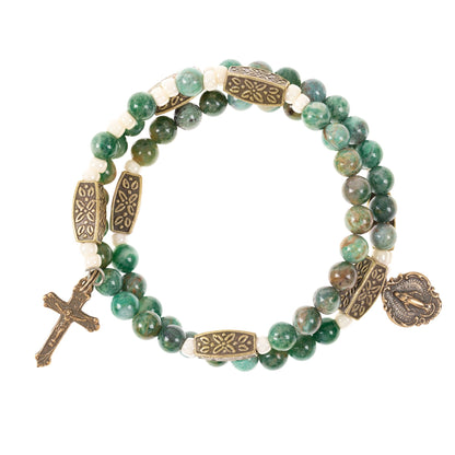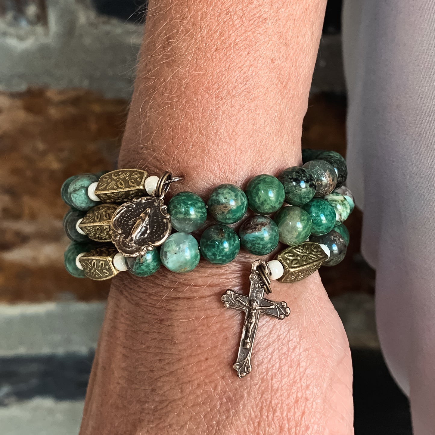 This beautiful vintage-style rosary wrap bracelet is created using semi-precious gemstones for the Hail Mary beads and bronze oblong Our Father beads. Since African "jade" is a green quartz with a blending of other colors with swirls, bands, spotted and "crackled" patterns and many Lighter areas have more translucency than darker areas, no two bracelets are alike! Both the simple crucifix and the Miraculous Medal are made of bronze recast from vintage medals, completing this unique rosary bracelet. Keep for yourself or give as a unique gift to a loved one!