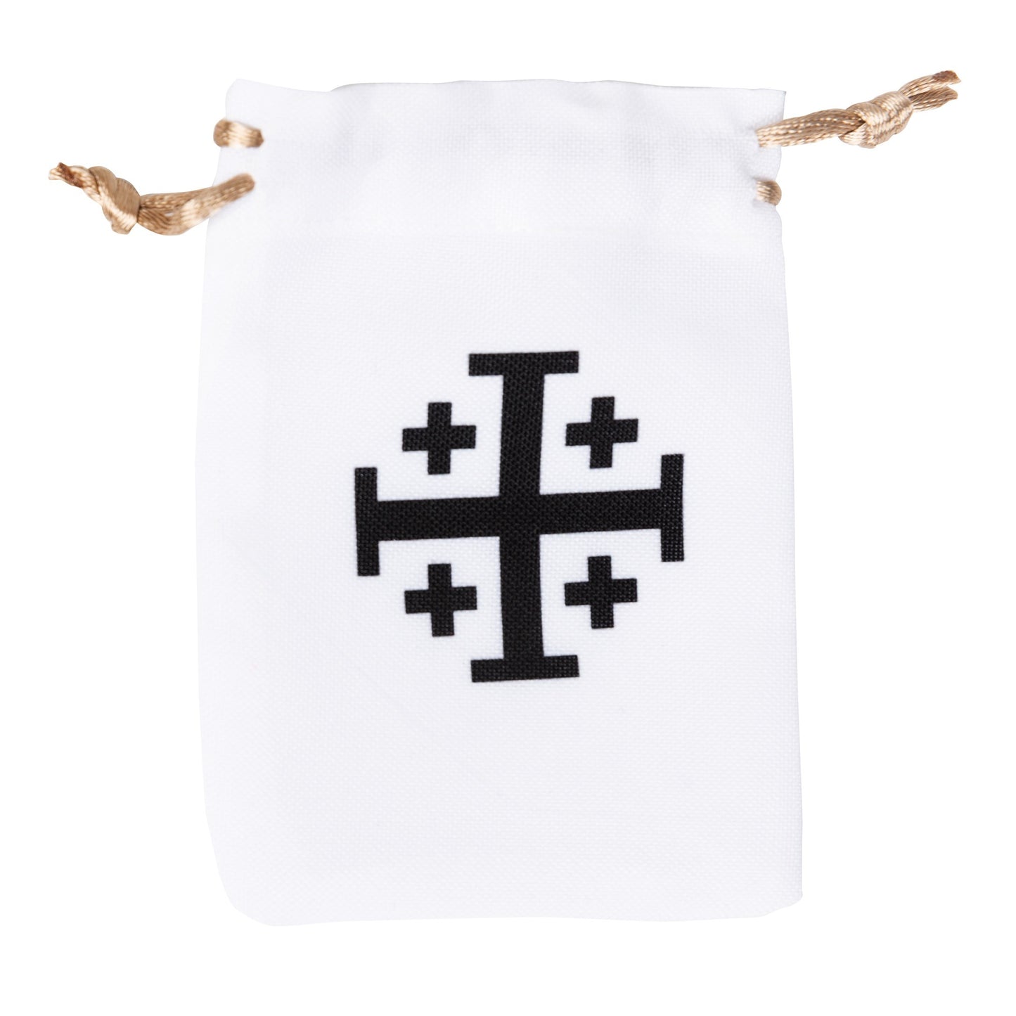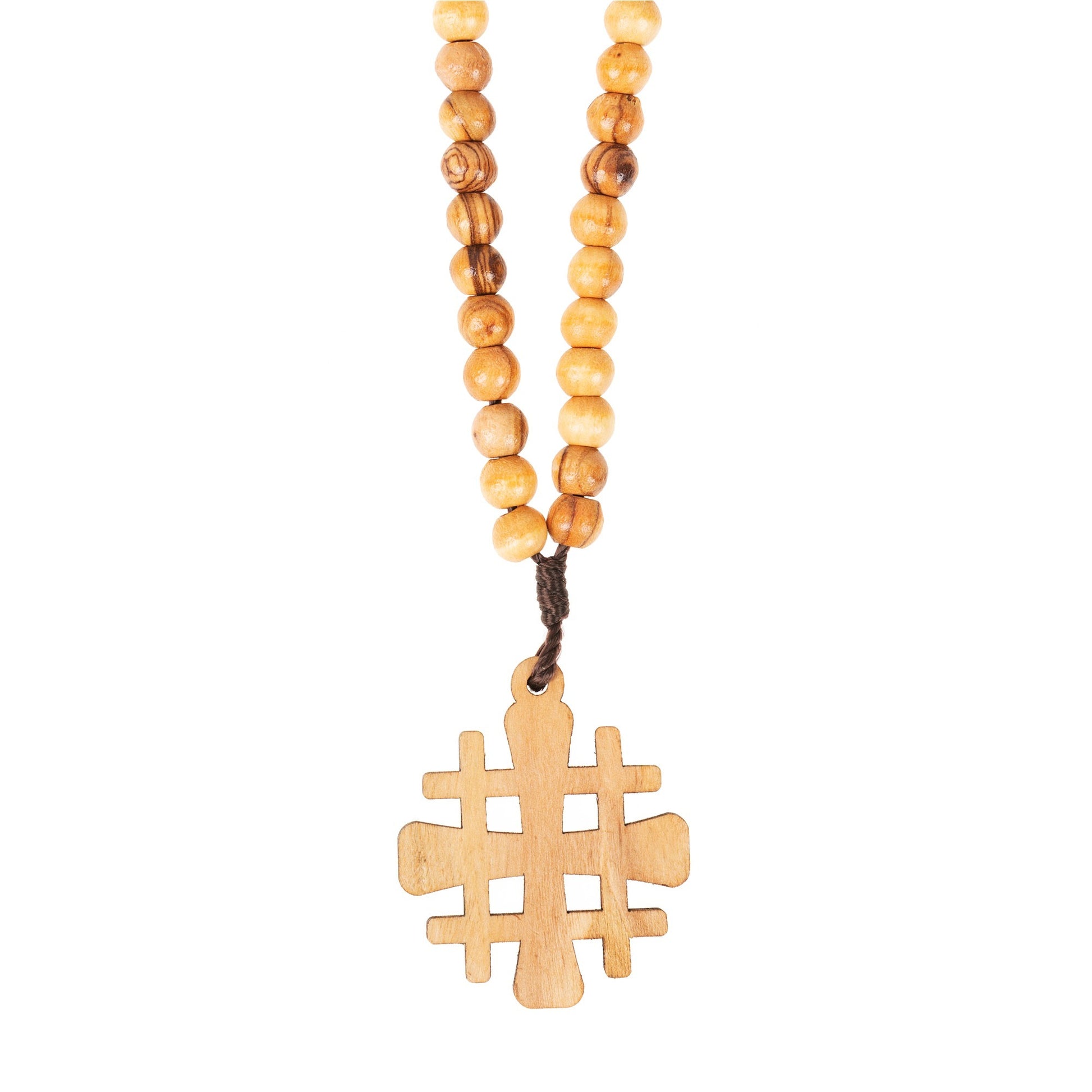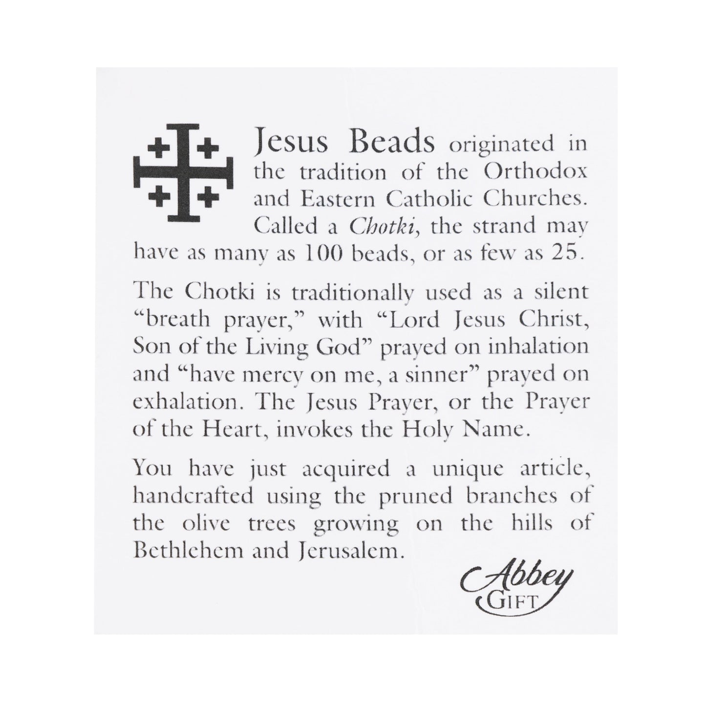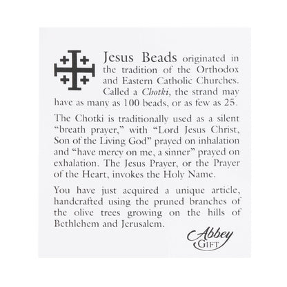 This handsome strand of hand made olive wood Jesus Beads in a warm, rich finish features a traditional and finely detailed Jerusalem Cross. The ancient devotional honors the name of Jesus and implores the mercy of God. This stand contains 100 smooth, round beads. The set is handcrafted using the pruned branches of the olive trees growing on the hills of Bethlehem and Jerusalem. Carry them in the accompanying stamped pouch for protection and safekeeping, so the beads can be taken wherever you go. Instruction Card included. Boxed for Gift Giving. Handcrafted by the Monks of St. Meinrad Archabbey.Â