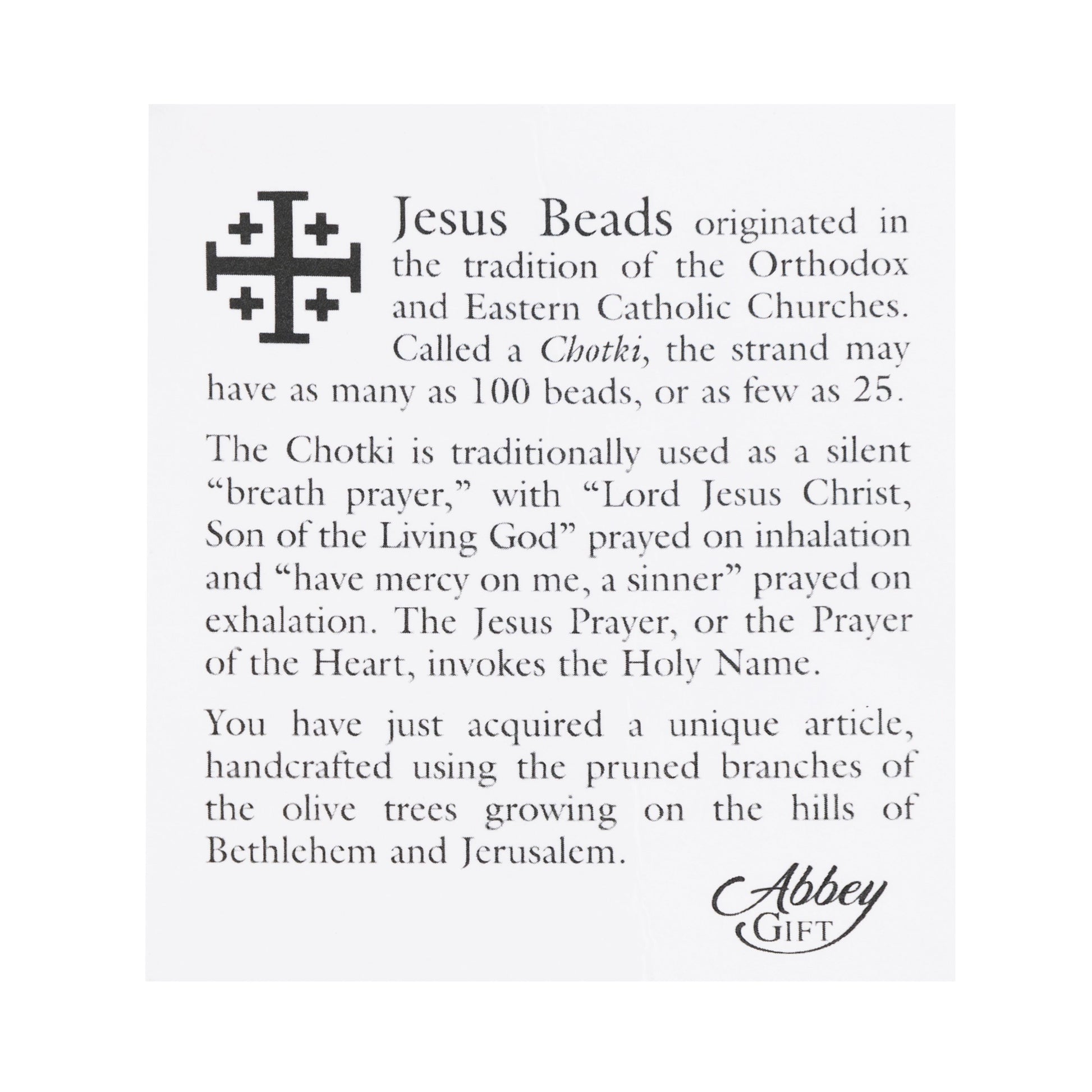 + Card Reads: Jesus Beads originated in the tradition of the Orthodox and Eastern Catholic Churches. Called a chotki, the strand may have as many as 100 beads or as few as 25. The chotki is traditionally used as a silent "breath prayer", with "Lord Jesus Christ, Son of the Living God" prayed on inhalation and "have mercy on me, a sinner" prayed on exhalation. This is known as the Jesus Prayer, or the Prayer of the Heart, which invokes the Holy Name of Jesus and implores His divine mercy. (You can read about the "Jesus Prayer" in the Catechism of the Catholic Church, paragraphs 2665-2669.)